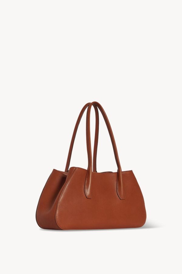 Geometric shoulder bag in polished saddle leather with tubular handles, flat base, and hand-stitched construction.