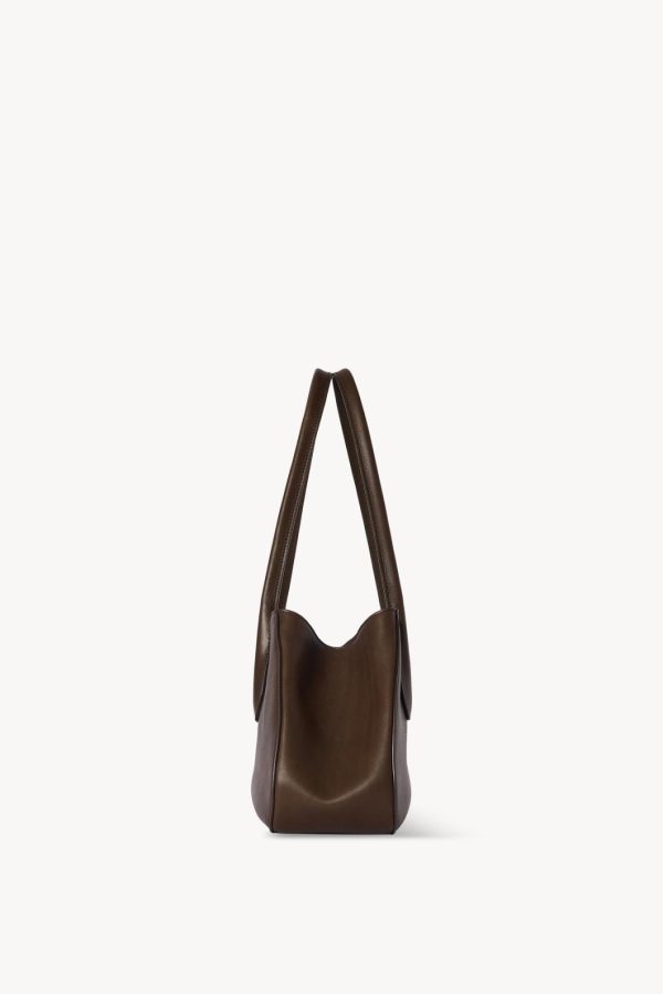 Geometric shoulder bag in polished saddle leather with tubular handles, flat base, and hand-stitched construction.