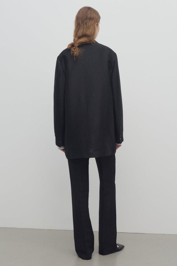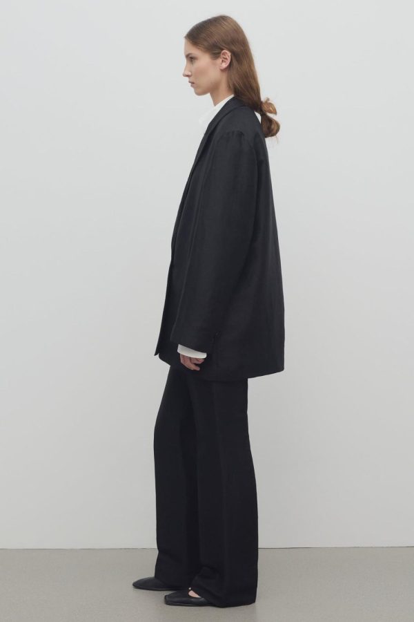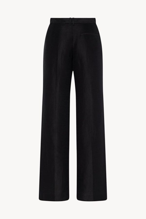 Mid-rise tailored trouser in textured linen with straight leg, pressed front and back creases, and slanted side pockets.