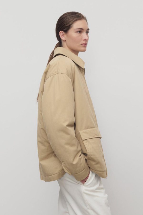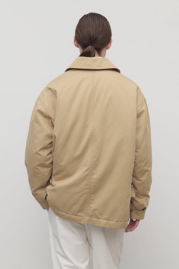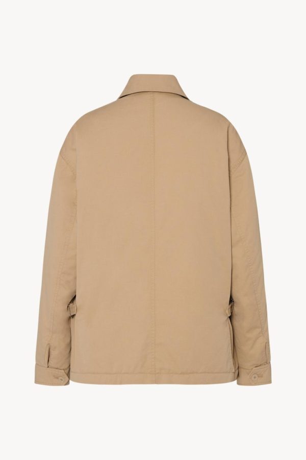 Collared jacket in cotton and cashmere gabardine with buckled straps at side waist, front patch pockets, and two-way front zip closure.