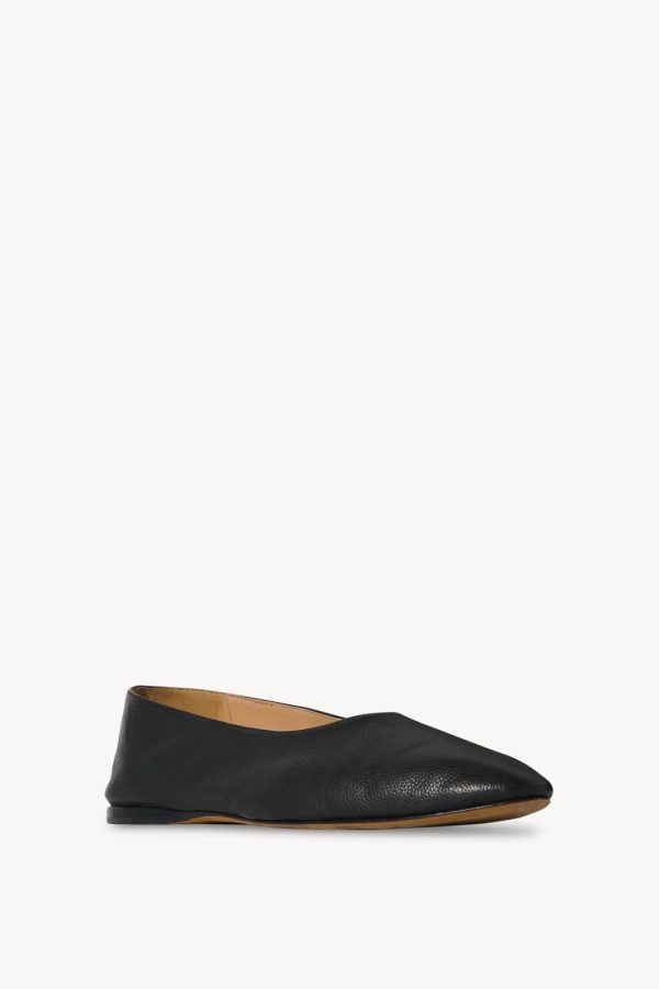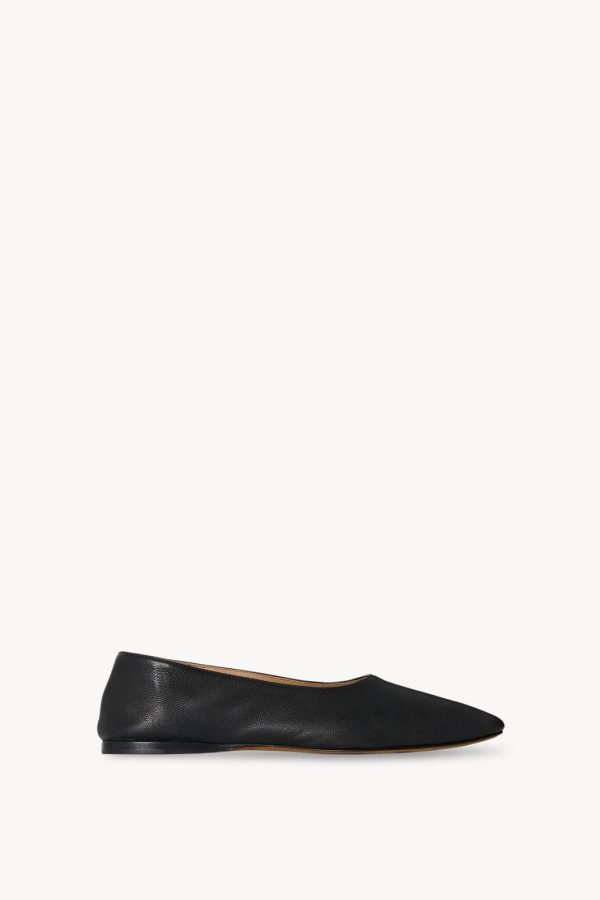 Minimal ballet flat in grained calfskin leather with oval toe, contrast lining, and leather sole.