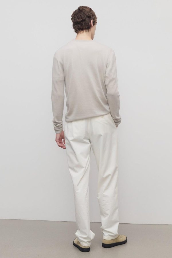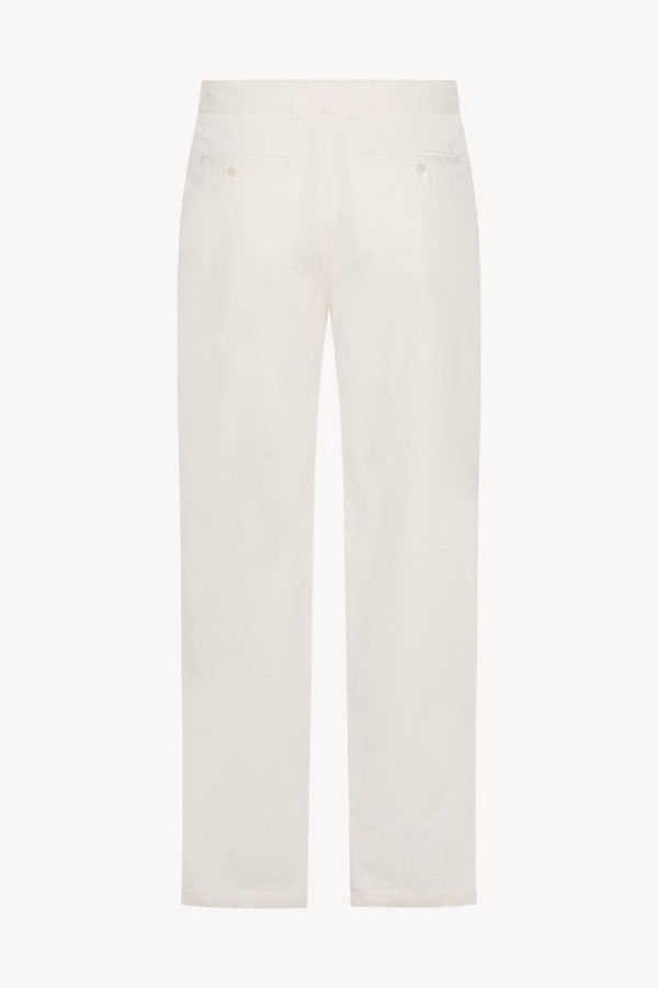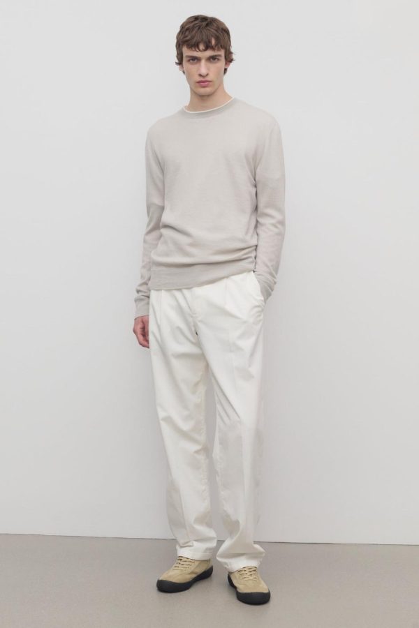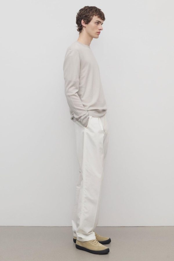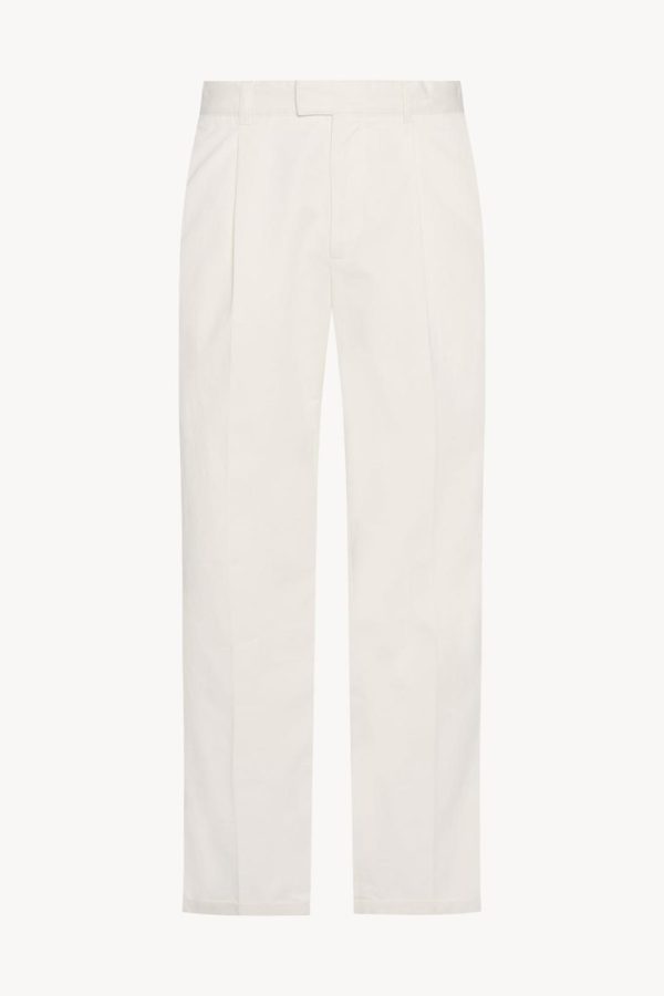 Tailored mid-rise trouser in cotton and cashmere gabardine with straight cuffed leg, pressed front pleats, and slanted side pockets.