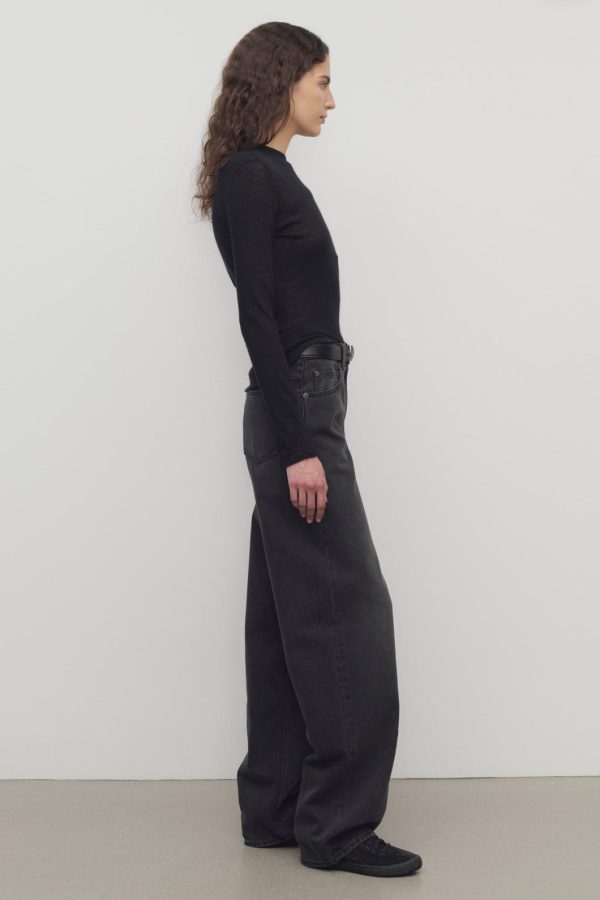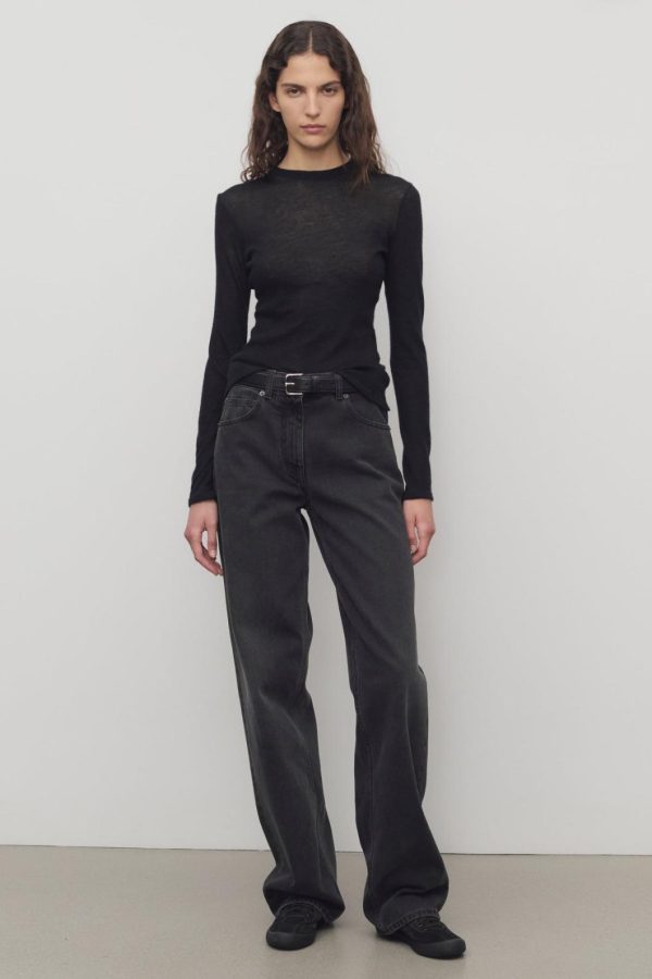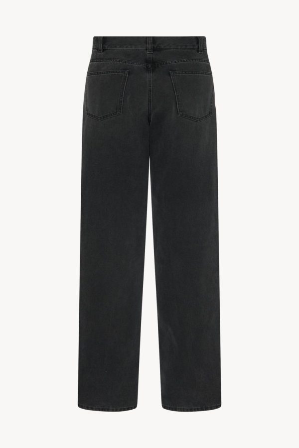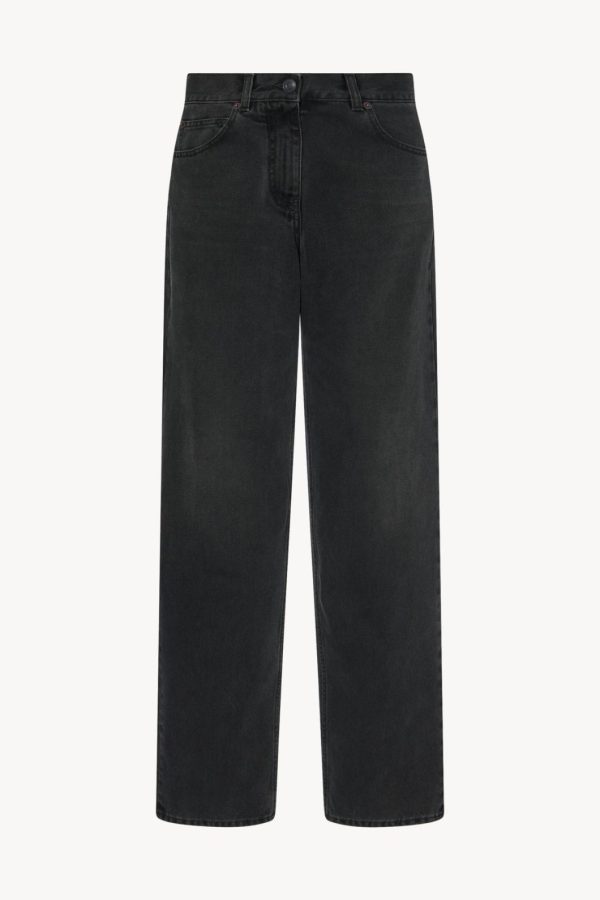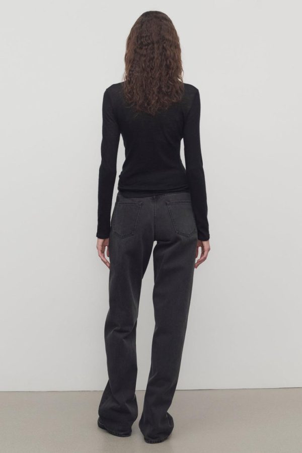 High-rise jean in gently faded cotton denim with straight leg and classic 5-pocket construction.