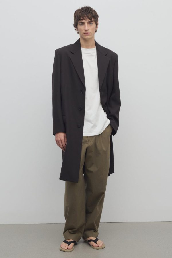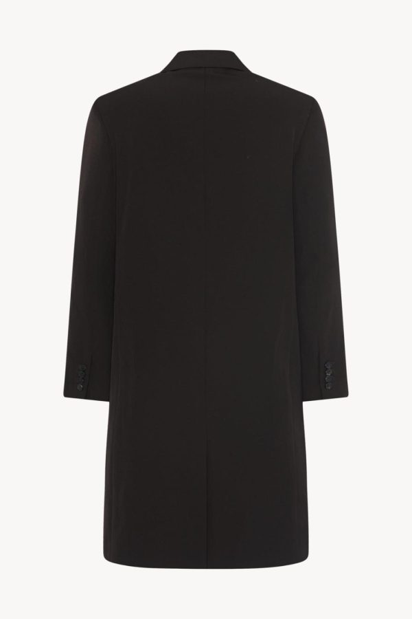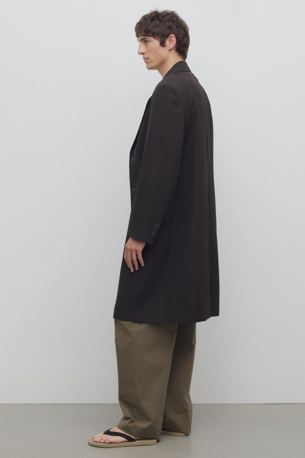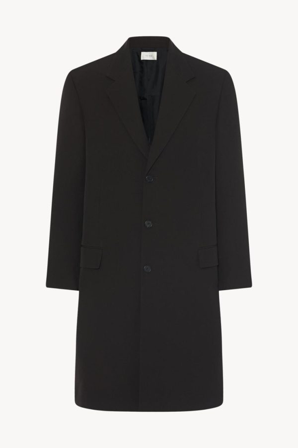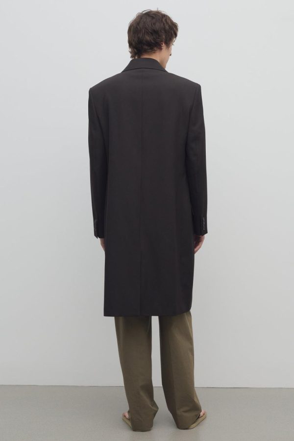 Single-breasted tailored coat in structured virgin wool with wide notched lapels, front flap pockets, and horn button closure.