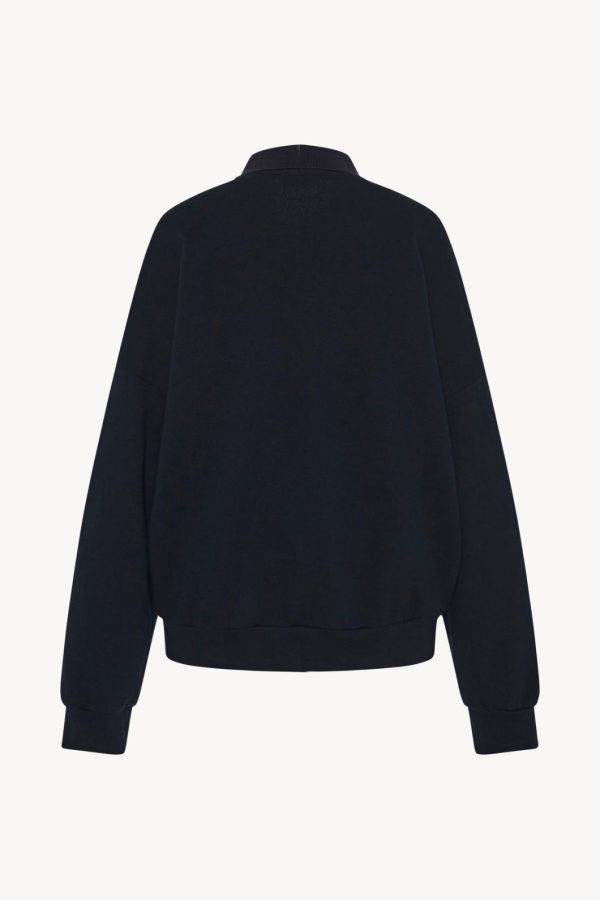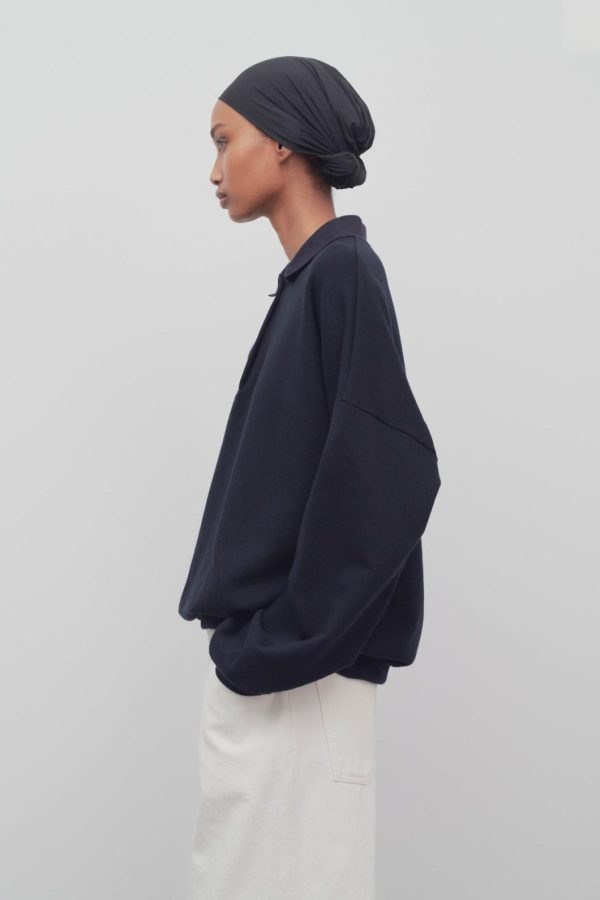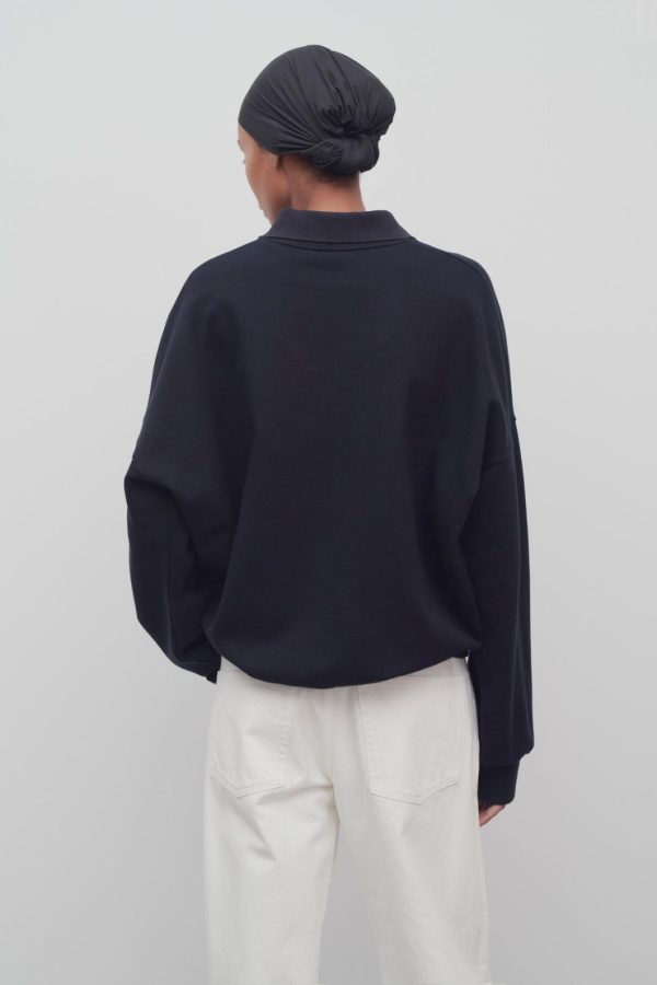 Oversized long-sleeved polo in fine French terry cloth with dropped shoulder and custom ribbed-knit collar.