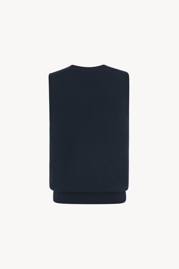 Classic v-neck sweater vest in finely knit wool and cotton with ribbed hem and back neckline.