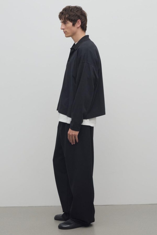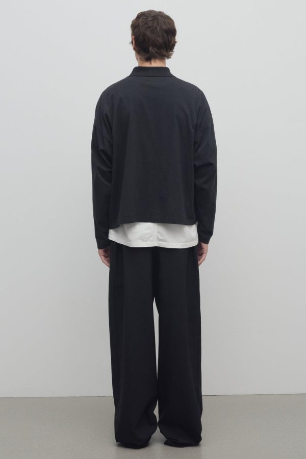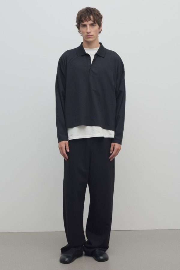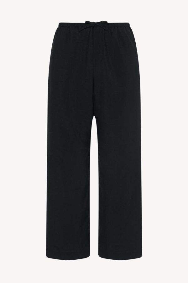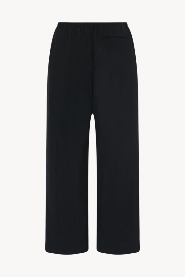Relaxed wide leg pant in mohair and wool with side seam pockets, zipper fly, and elasticated waistband with drawstring closure.