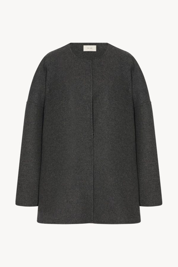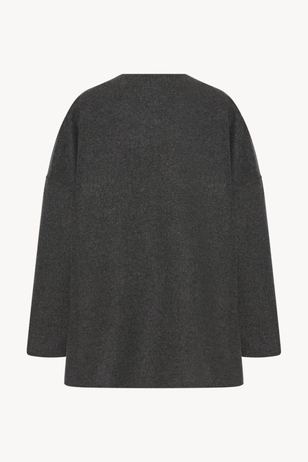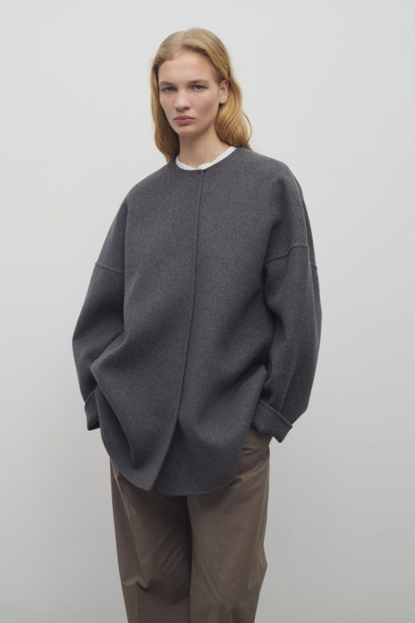Oversized hand-crafted jacket in double-faced cashmere with dropped shoulders, side seam pockets, and concealed hook and eye closure.