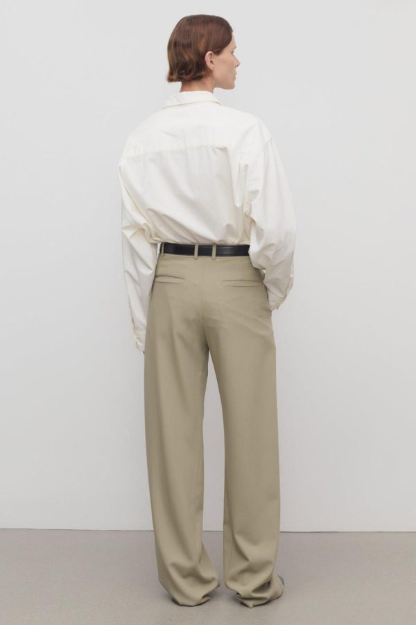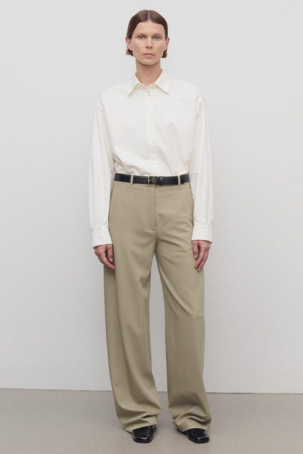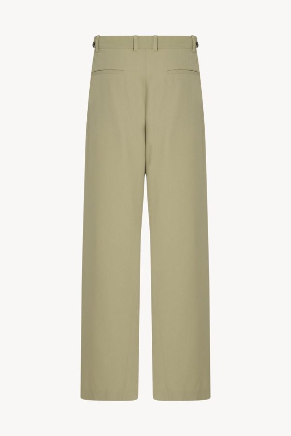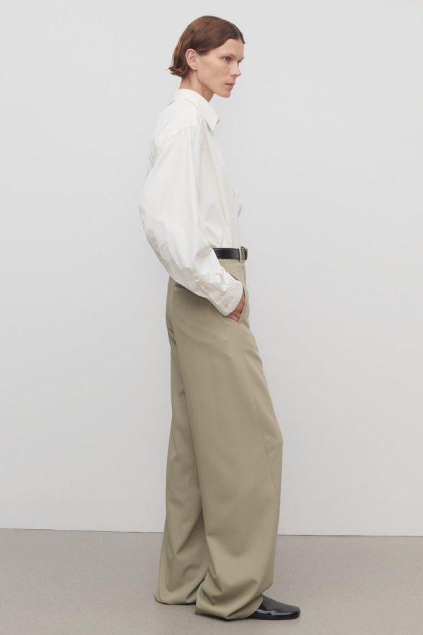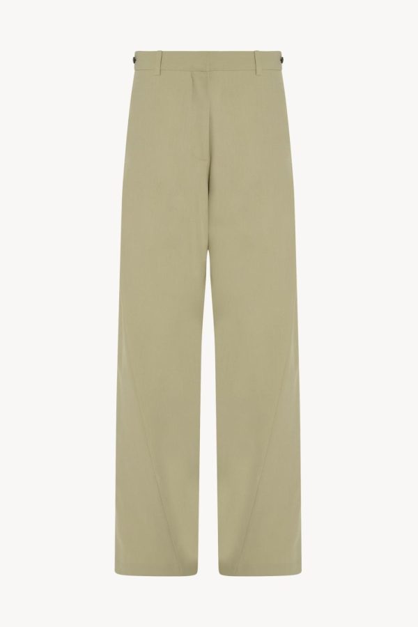 Relaxed mid-rise trouser in smooth virgin wool gabardine with straight leg, twisted seam detail, and side seam pockets.