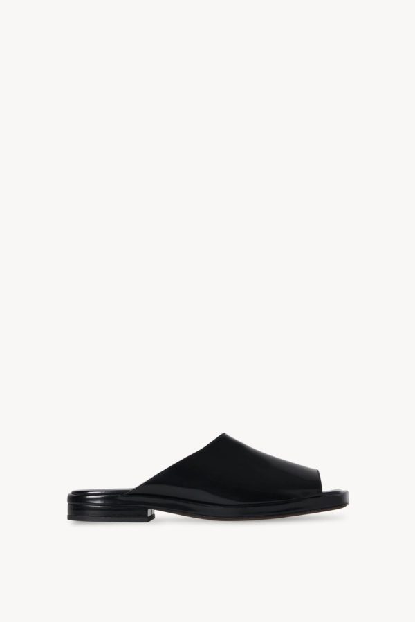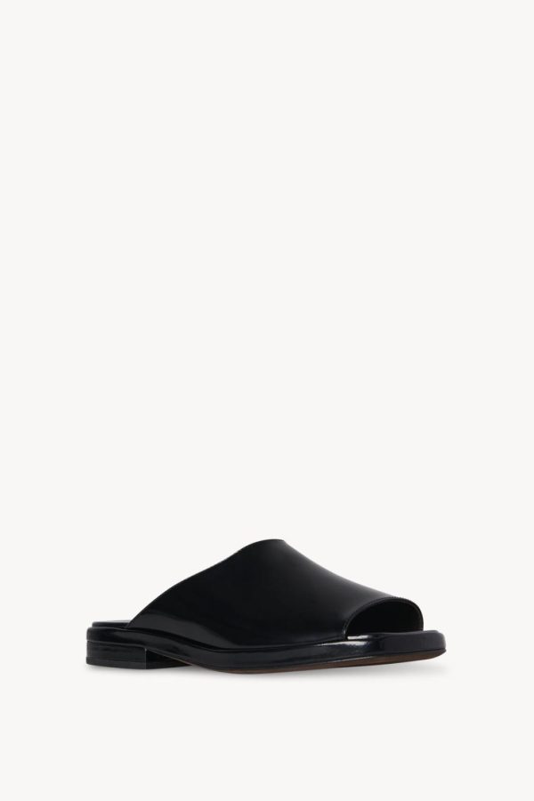 Heeled mule sandal in polished calfskin leather with open, squared toe, contoured footbed, and stacked leather heel.