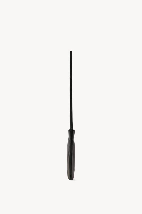 Gently curved shoulder bag in smooth nappa leather with slim strap, embossed logo on side, and zipper closure.