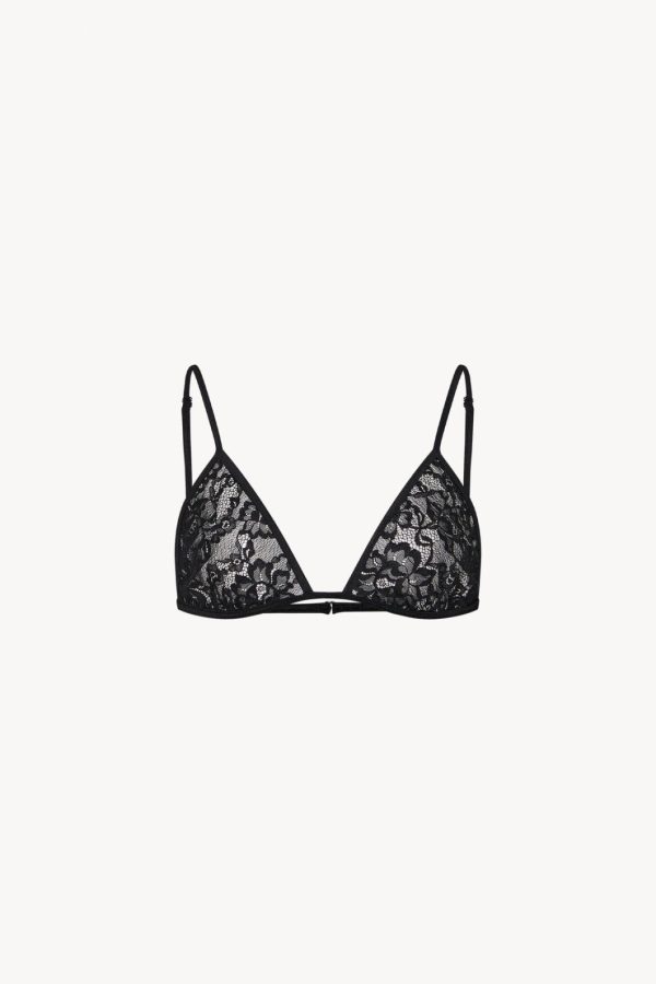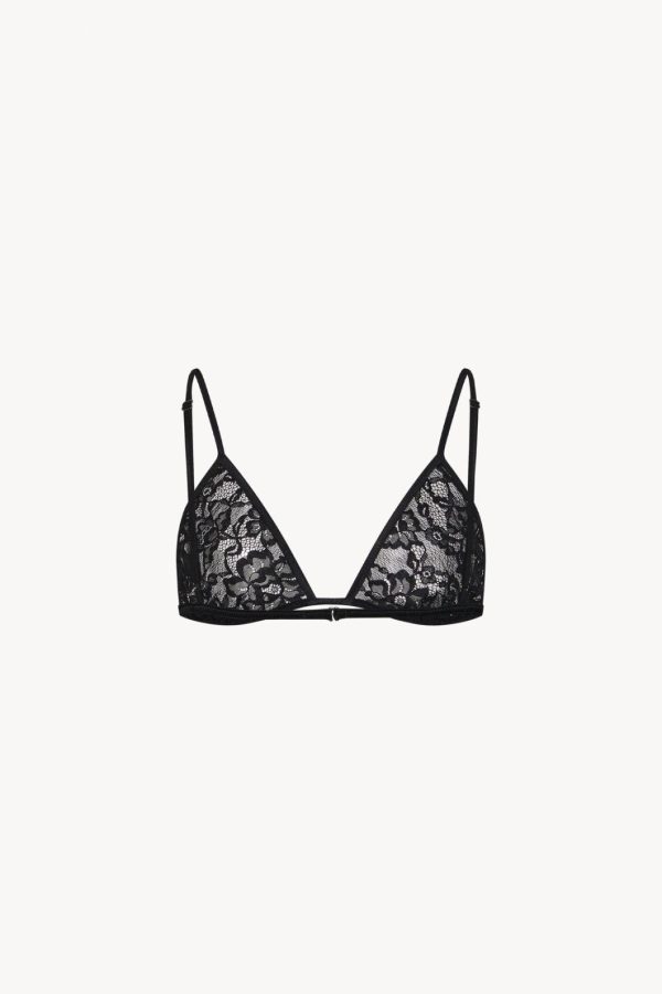 Triangle bralette in floral jacquard lace with adjustable spaghetti straps and back hook closure.