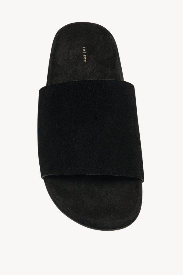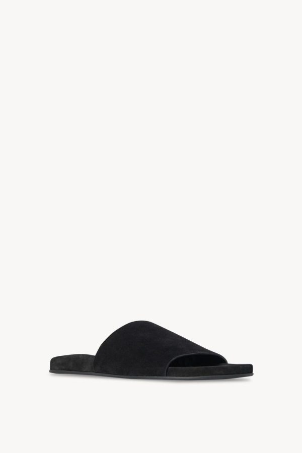 Flat slip-on sandal in soft calfskin suede with contoured footbed and rubber sole.