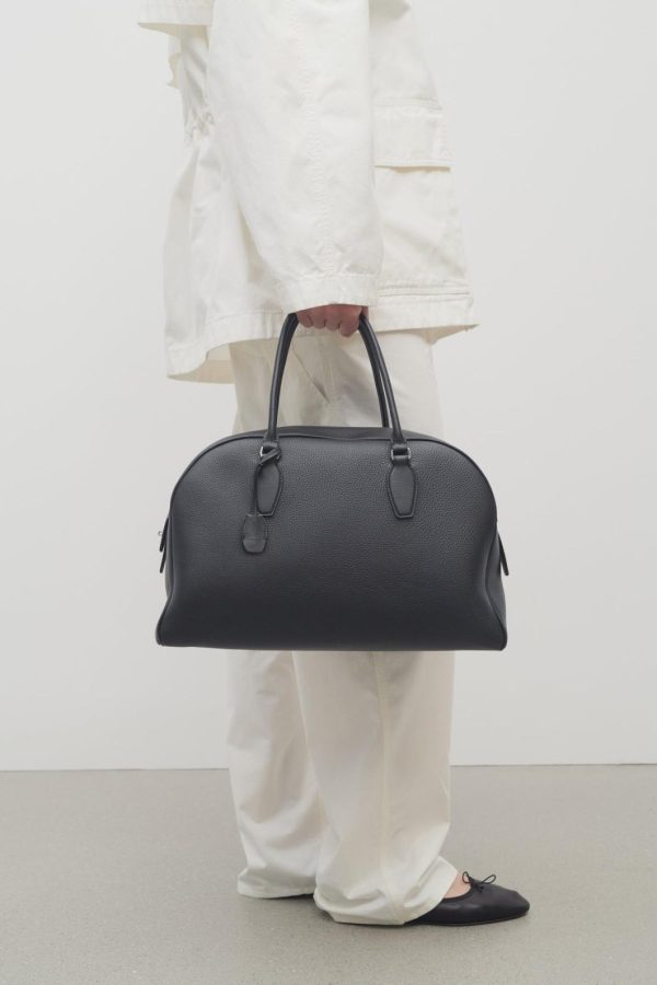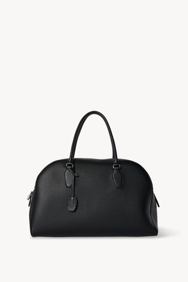 Updated bowling bag in textured calfskin leather with tubular handles, branded metal padlock and key, and zipper closure.