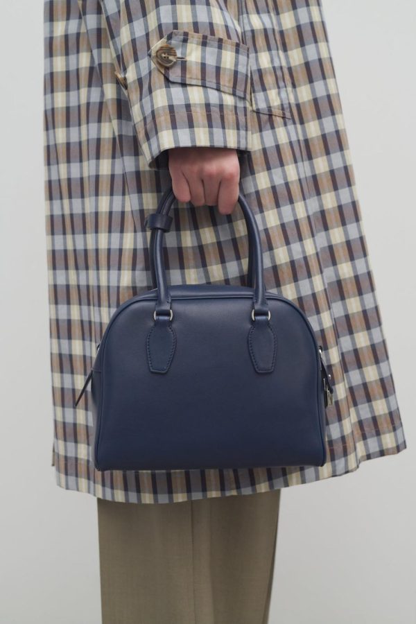Updated bowling bag in polished saddle leather with tubular handles, branded metal padlock and key, and zipper closure.