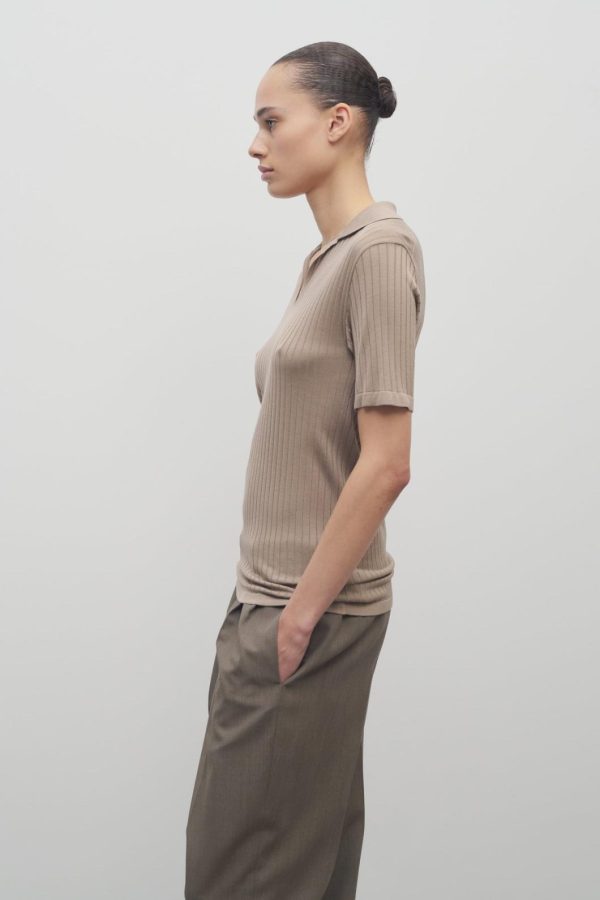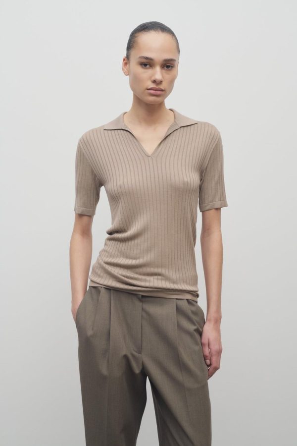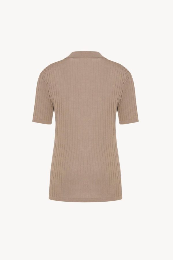 Short-sleeved polo top in fluid viscose silk with open front placket, ribbed collar, and slim fit.