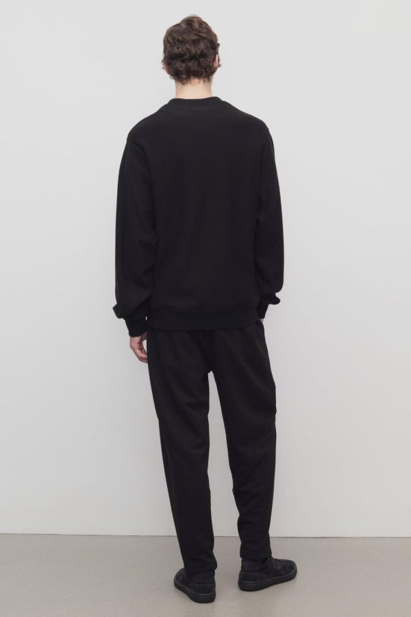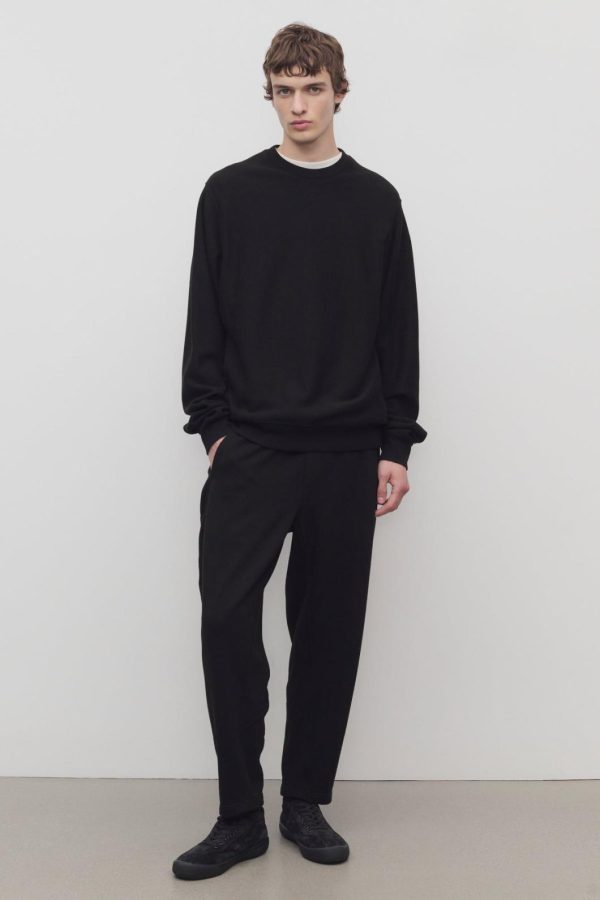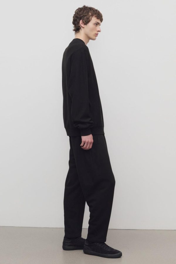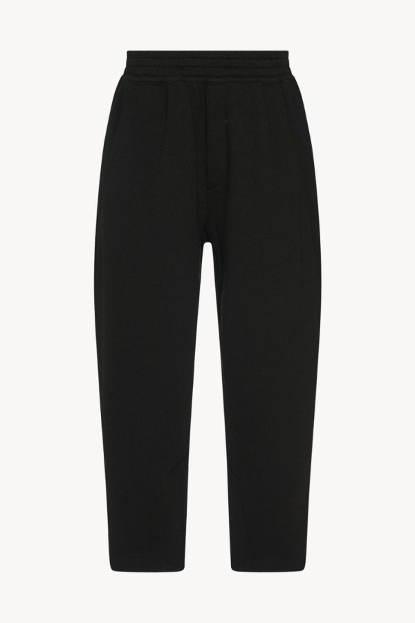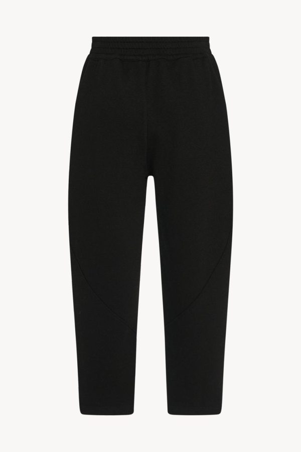 Relaxed pull-on pant in cotton and cashmere French terry with tapered hem, side seam pockets, and topstitched elastic waistband.