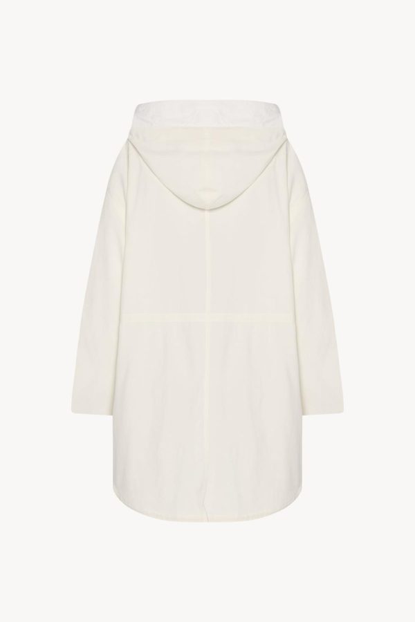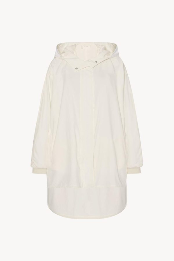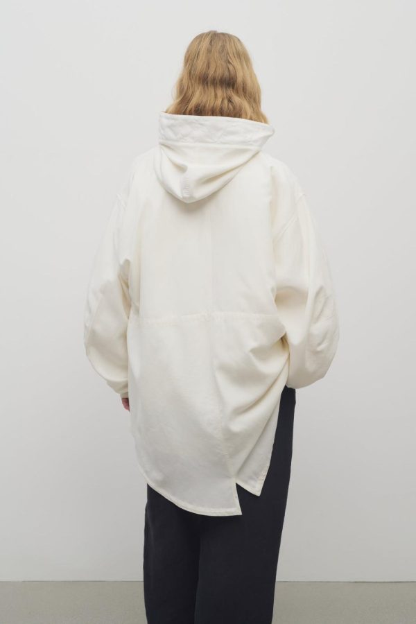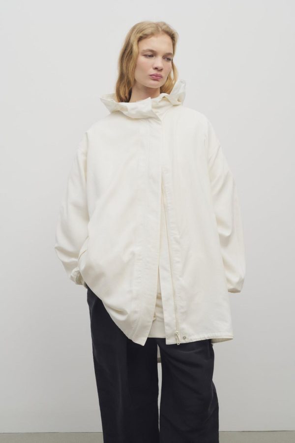 Oversized hooded parka in washed silk toile with ribbed cuffs, interior drawstring at waist, and concealed front placket with snap and zipper closure.