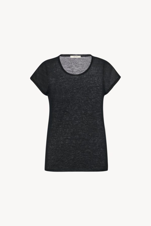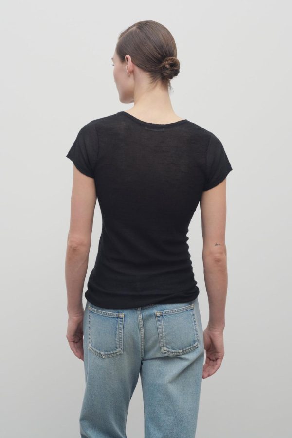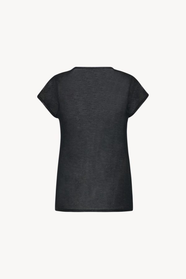 Relaxed t-shirt in ultrafine textured cashmere with rounded neckline, cap sleeves, and slim fit.