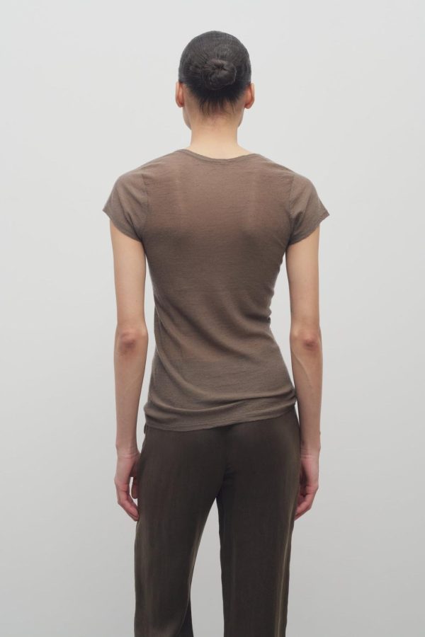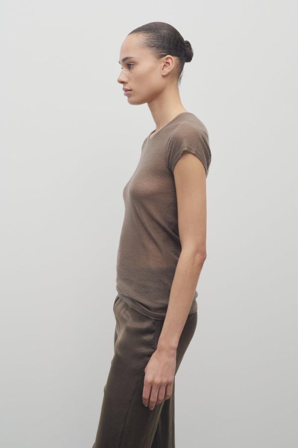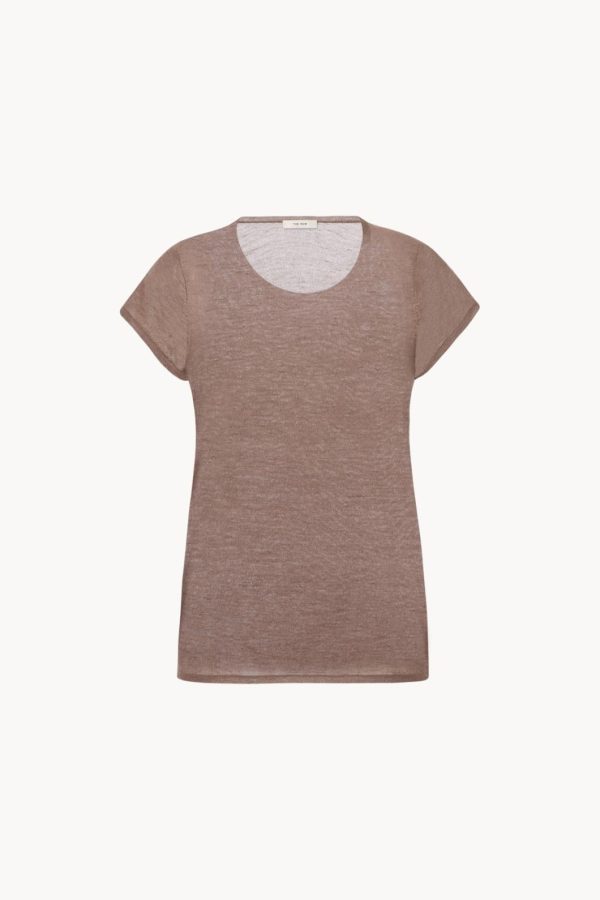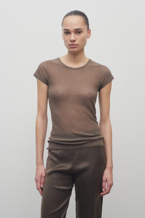 Relaxed t-shirt in ultrafine textured cashmere with rounded neckline, cap sleeves, and slim fit.
