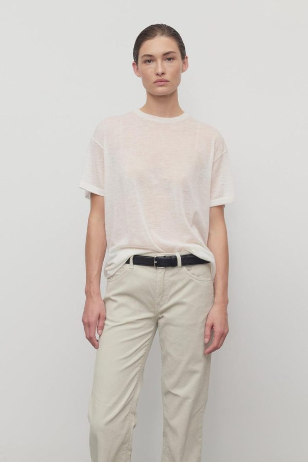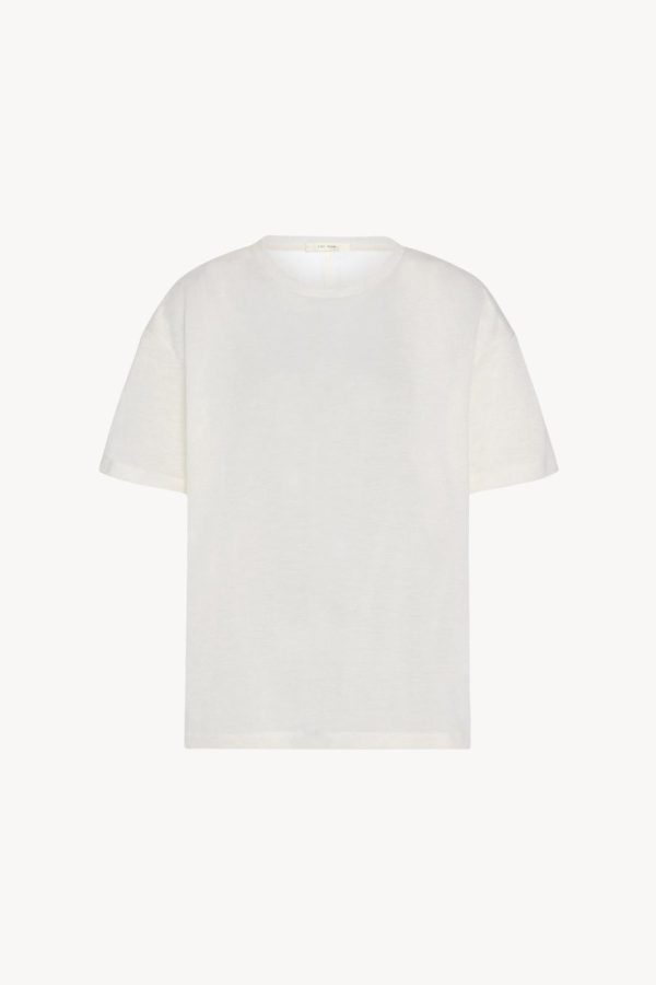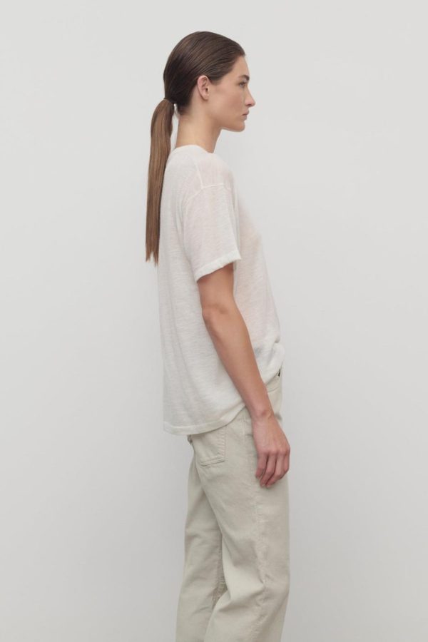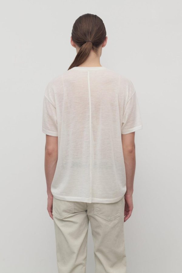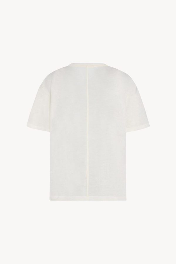 Relaxed, short-sleeved t-shirt in soft cashmere jersey with ribbed crewneck and signature center back detail.