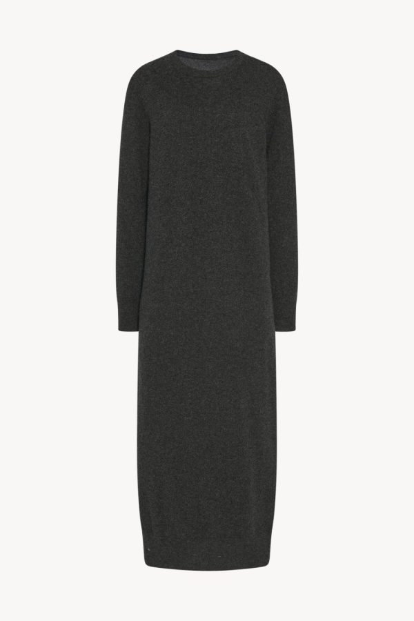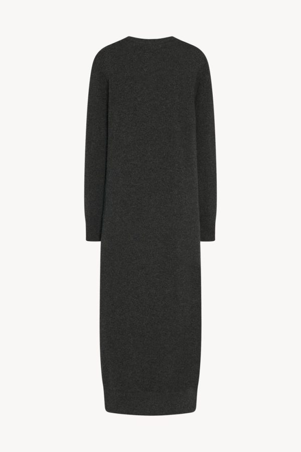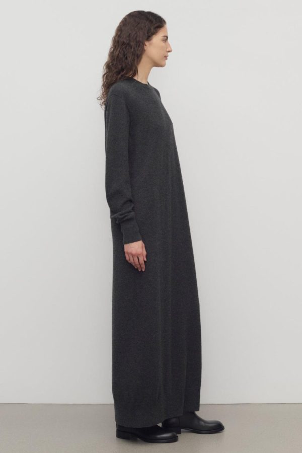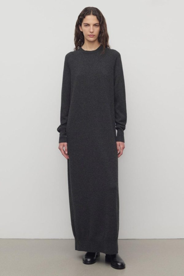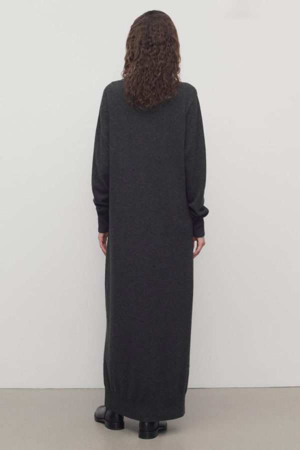 Ankle-length long-sleeved dress in soft cashmere with loose fit, seamless construction, and ribbed crewneck, cuffs, and hem.
