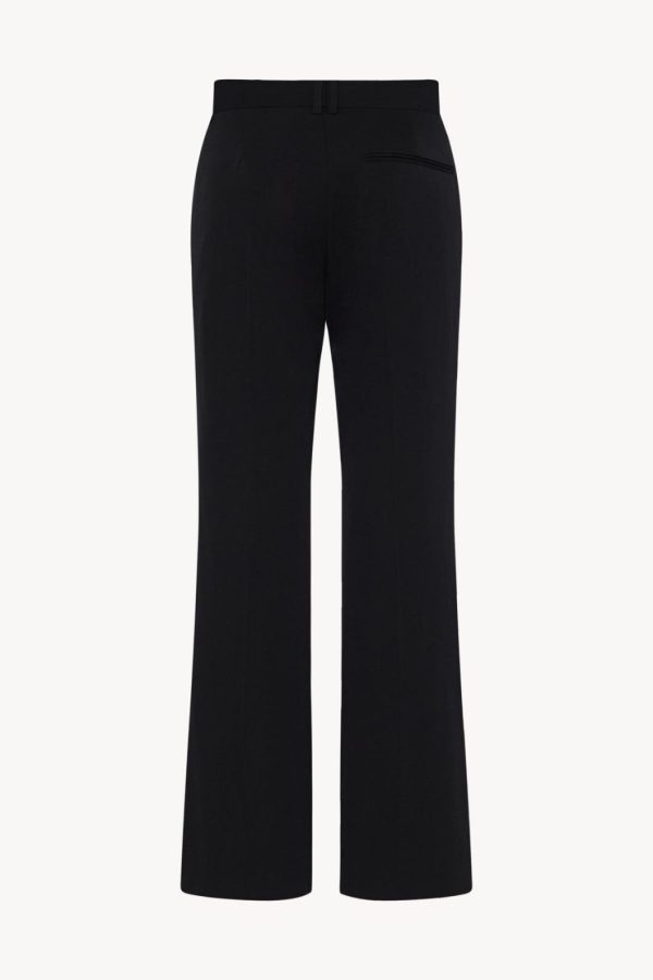 Low-rise trouser in textured wool with slanted side pockets, pressed front and back creases, and slightly flared hem.
