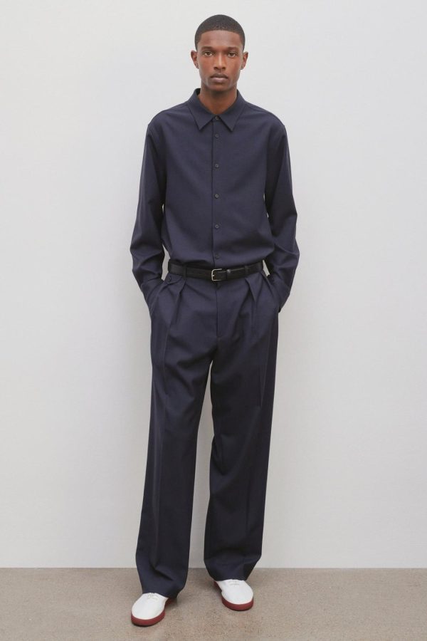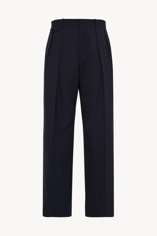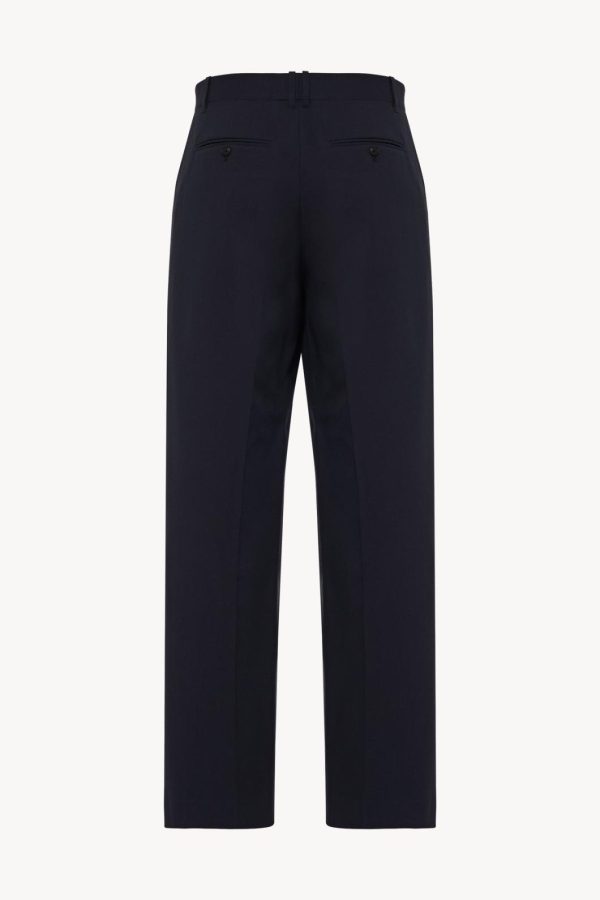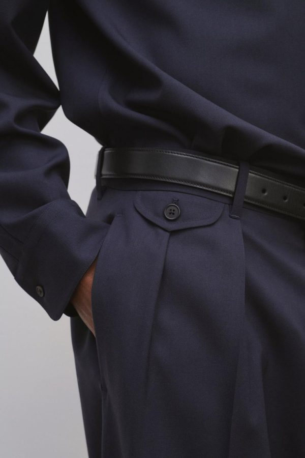 Mid-waisted pant in soft wool gabardine with double pleated front, side seam pockets, button-down back pockets and triangular coin pocket.