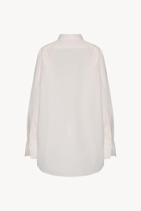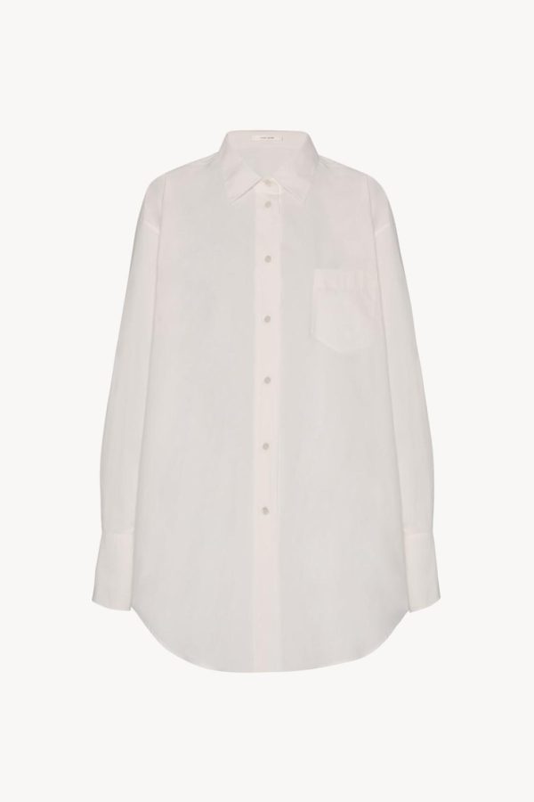 Classic button-up shirt in sanded cotton poplin with front patch pocket, elongated cuffs, and exposed front placket with mother-of-pearl buttons.