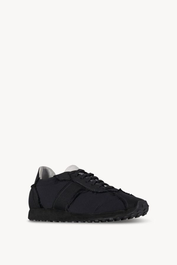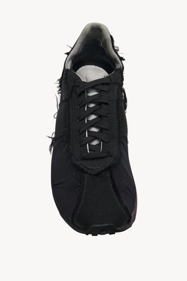 Deconstructed sneaker in canvas and technical nylon with raw edge finish and cushioned sole with micro rubber tread.