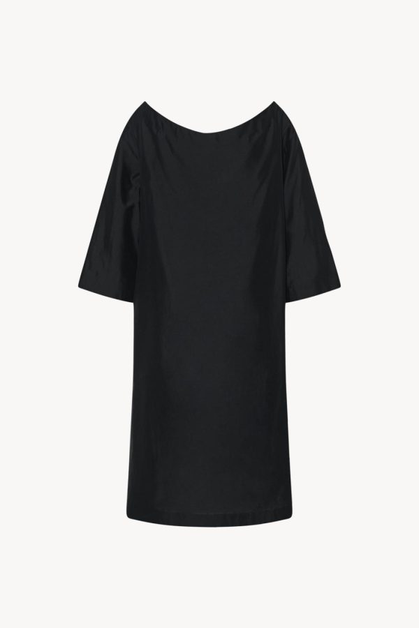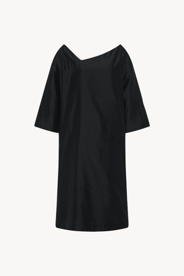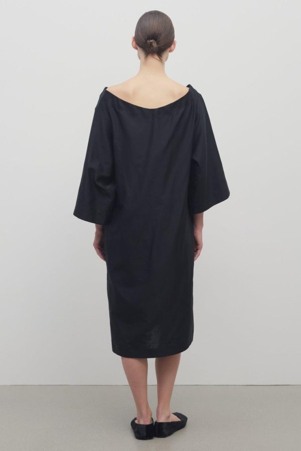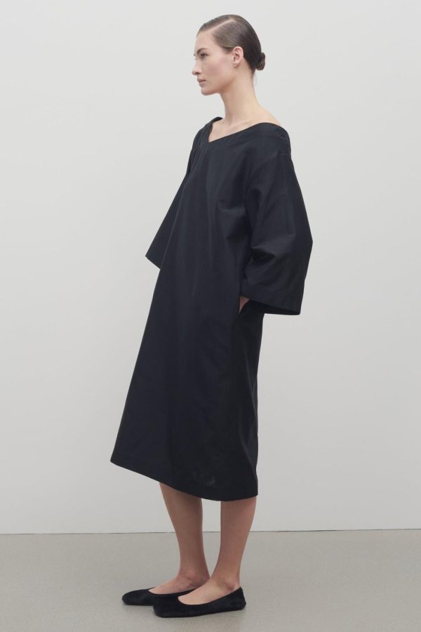 Architectural knee-length dress in woven cotton and silk voile with asymmetrical boatneck, voluminous sleeves, and straight fit.