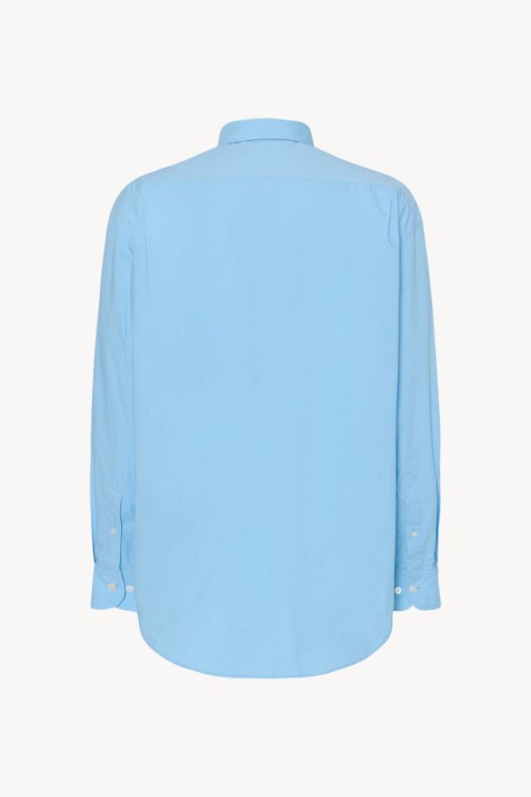 Classic button-up shirt in washed cotton poplin with slim back yoke, curved hem, and exposed front placket with mother-of-pearl buttons.