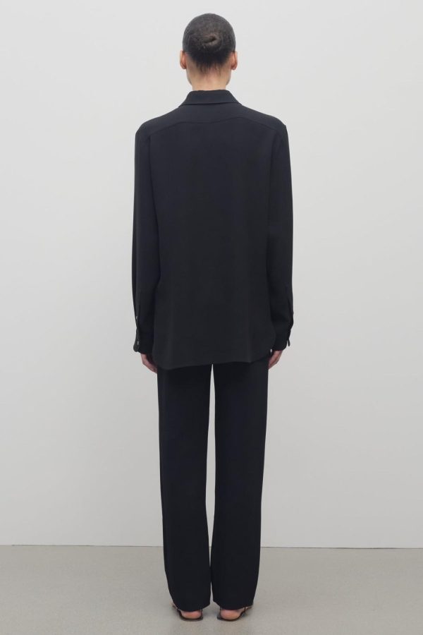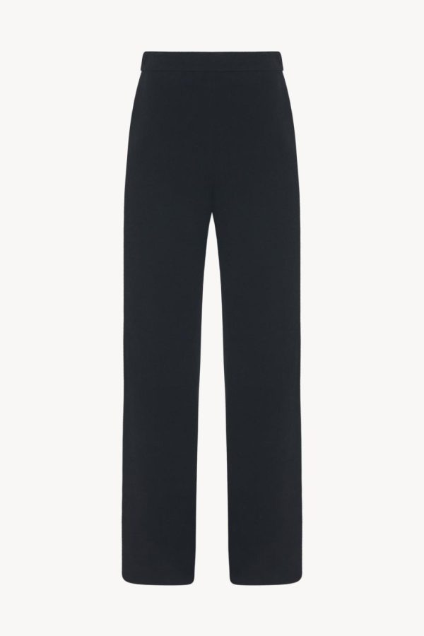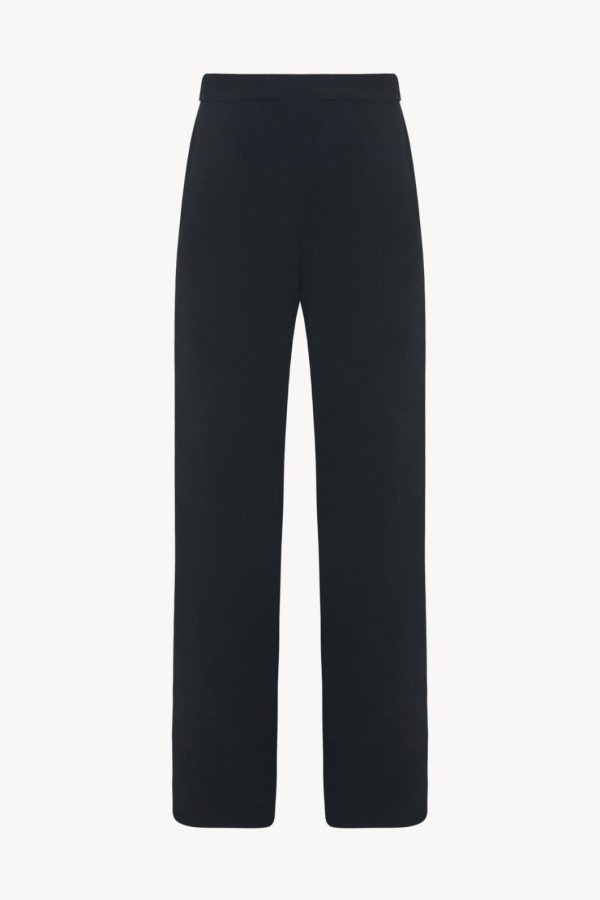 Minimal trouser in fluid stretch cady with cropped straight leg and concealed zipper closure.