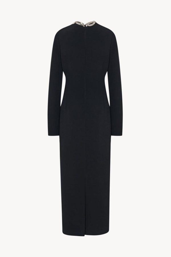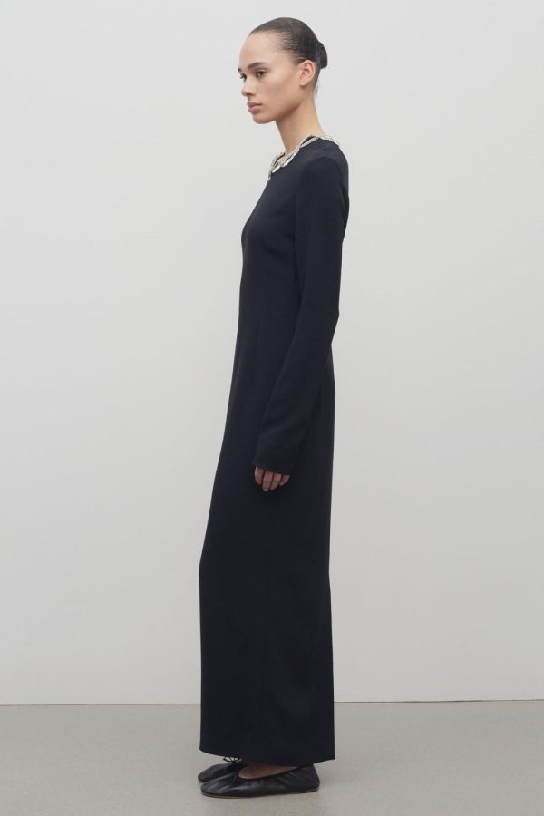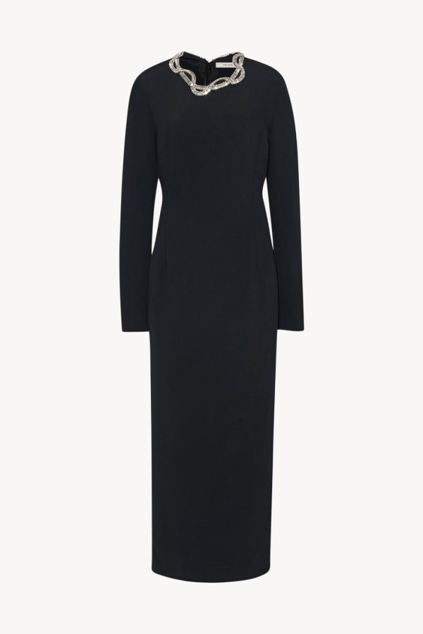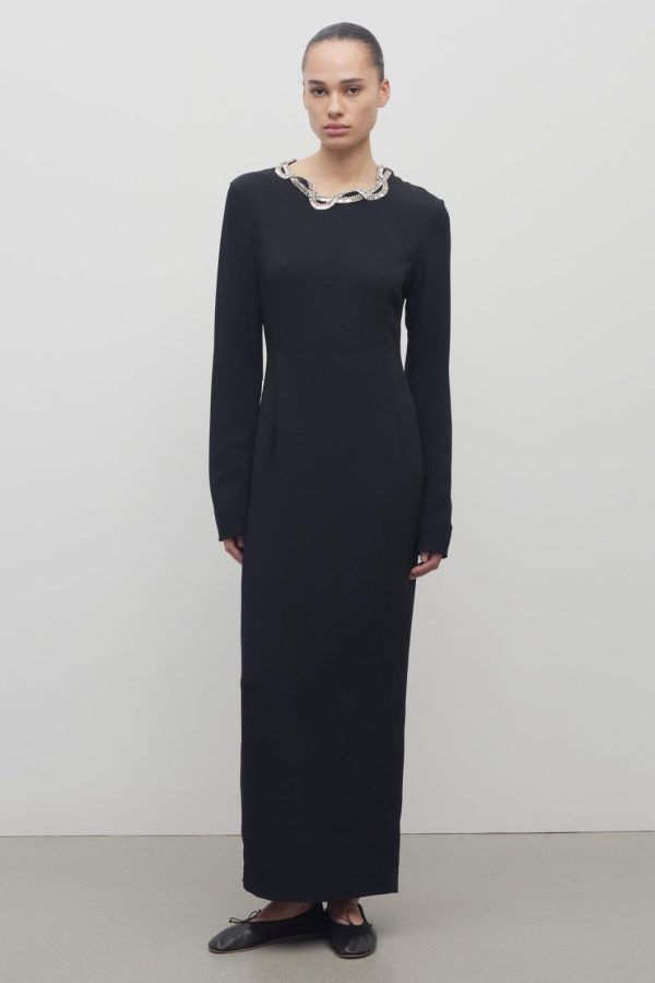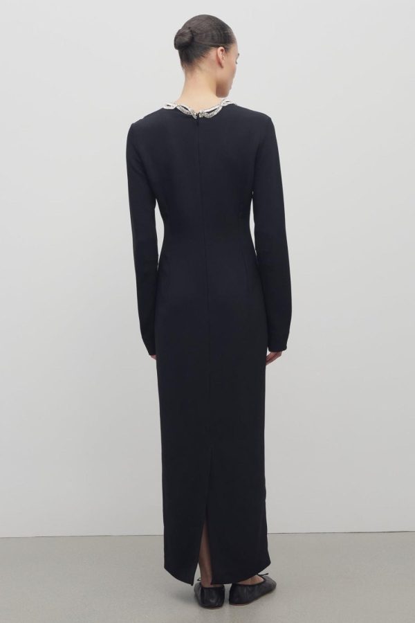 Ankle-length column dress in fluid stretch cady with hand-embellished asymmetrical neckline, center back hem vent, and fitted silhouette.