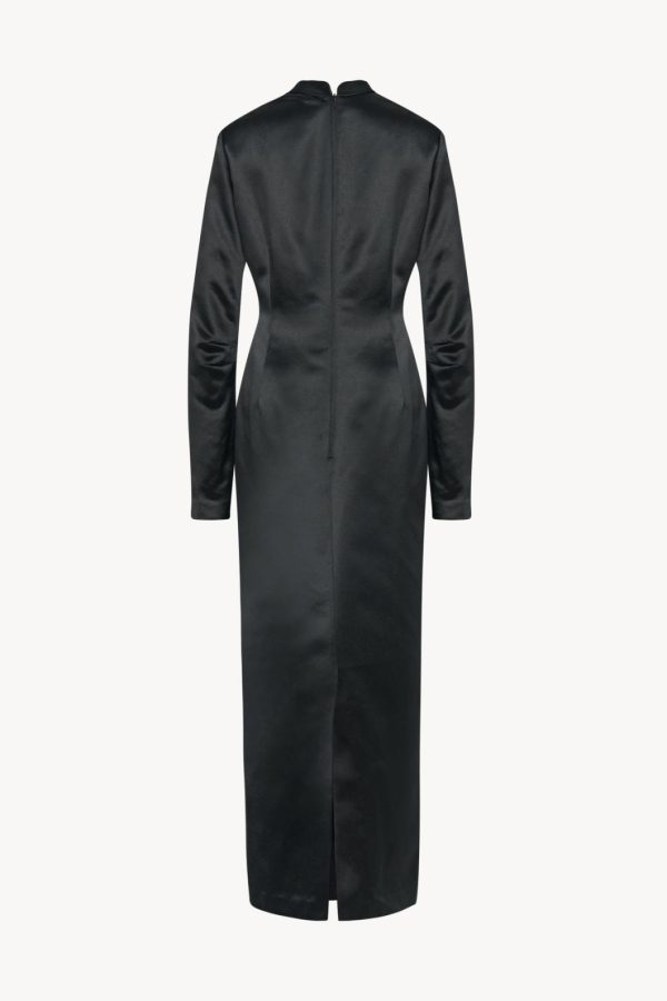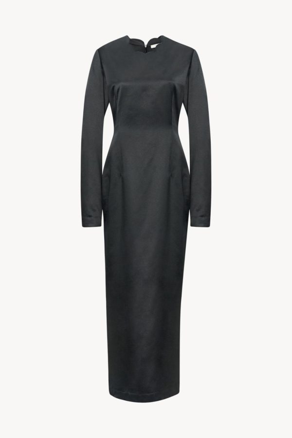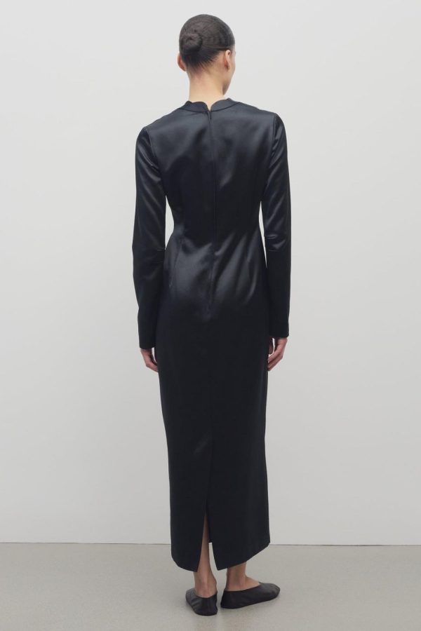 Ankle-length column dress in heavyweight silk satin with scalloped neckline, center back hem vent, and fitted silhouette.