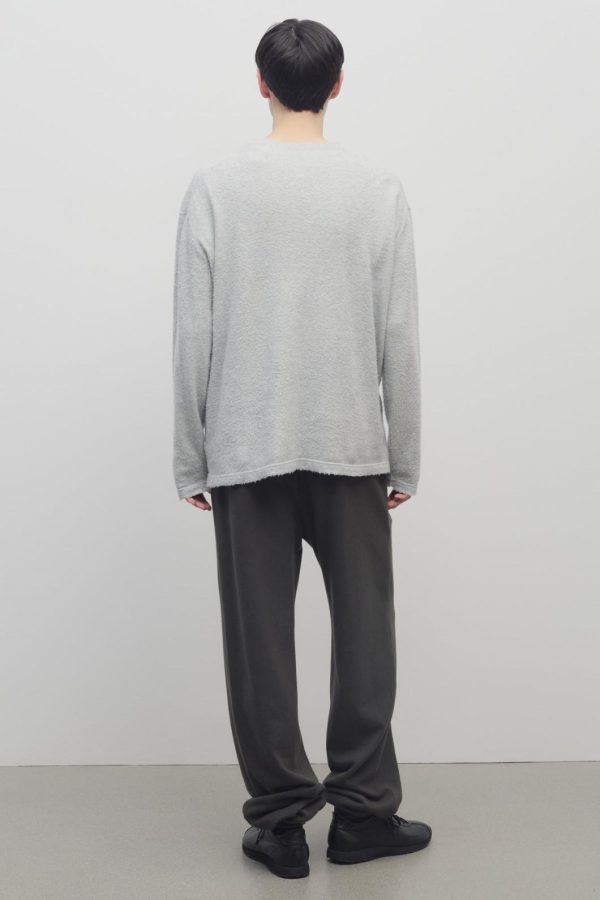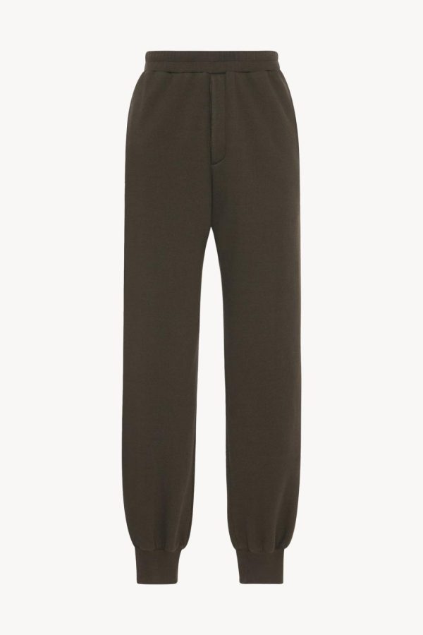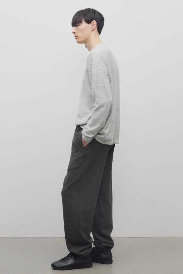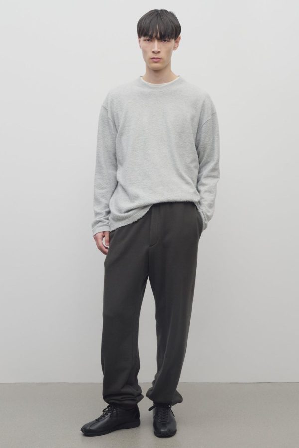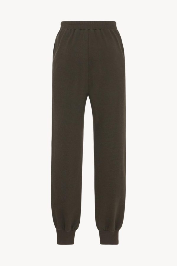 Mid-rise jogger pant in cotton and cashmere French terry with straight leg, side seam pockets, and gathered elastic cuffs and waistband.