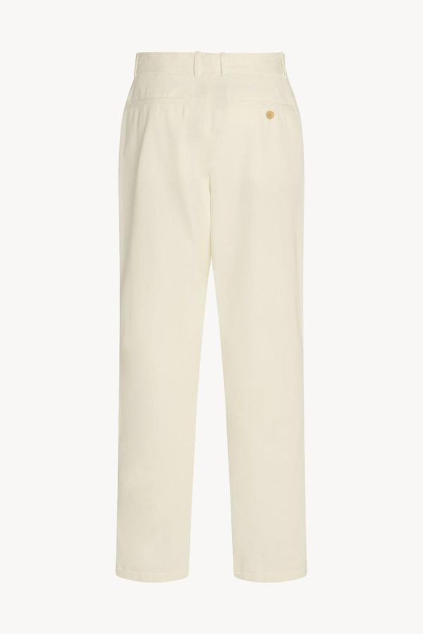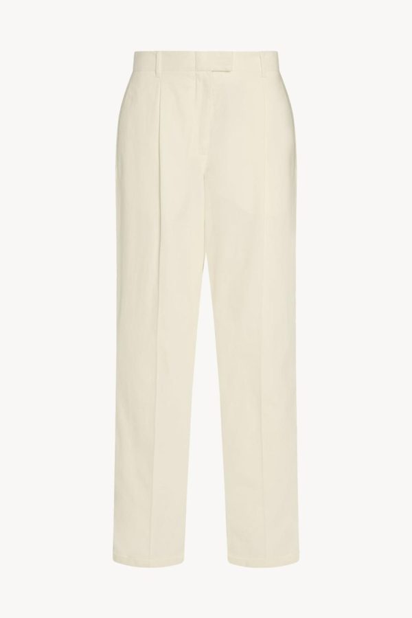 High-rise tailored trouser in cotton and cashmere gabardine with slightly tapered leg, pressed front creases, and slanted side pockets.