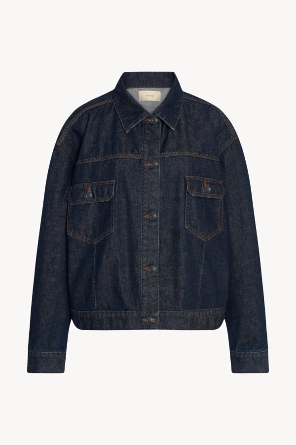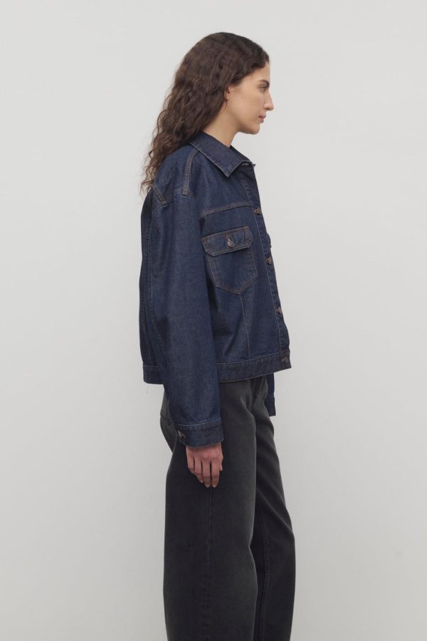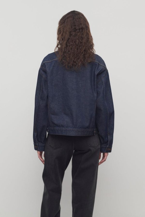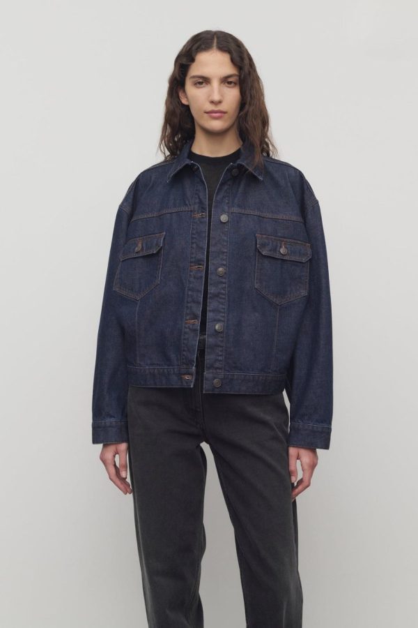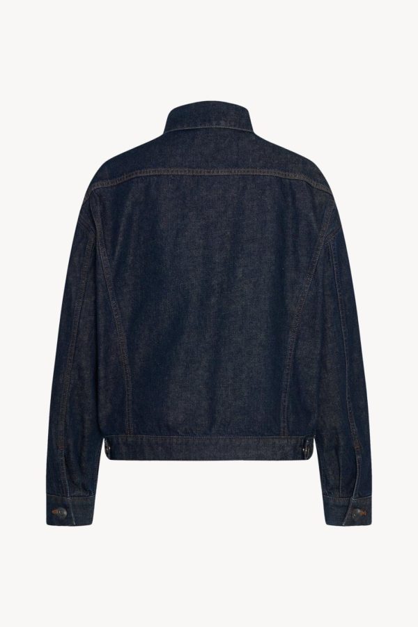 Oversized jean jacket in Japanese Supima cotton denim with front patch pockets and center front placket with horn button closure.