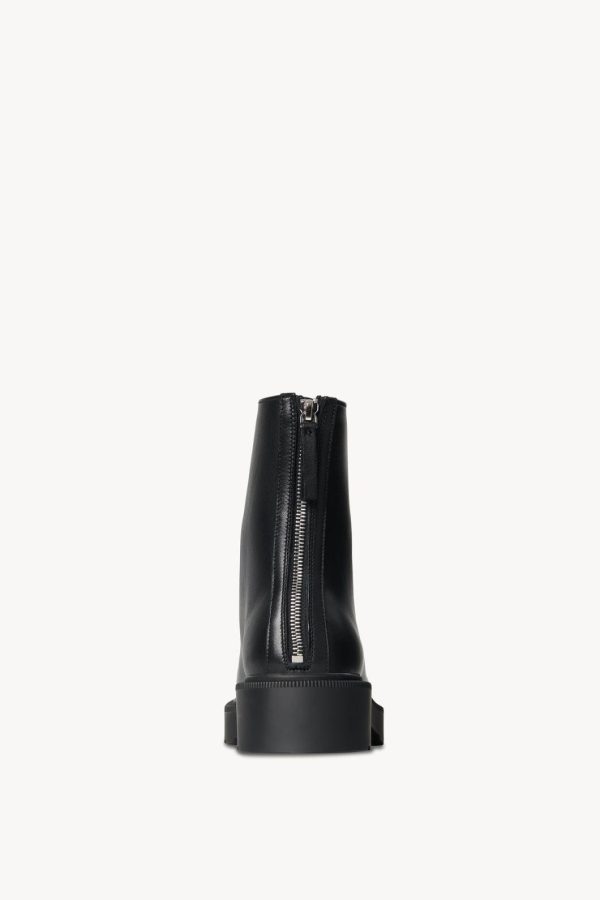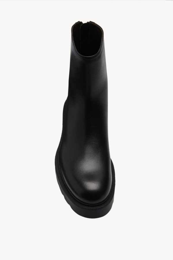 Versatile ankle boot in polished calfskin leather with round toe, back zipper closure, and treaded rubber platform sole.