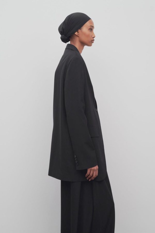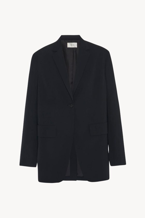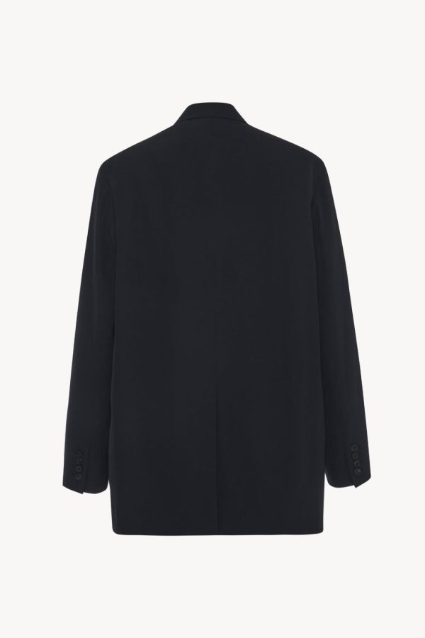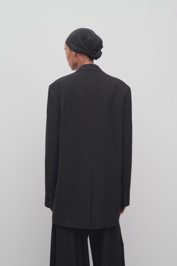 Oversized single-breasted tailored jacket in lightweight viscose and virgin wool with hand-pick stitched notch lapel, front flap pockets and back vent.