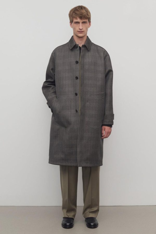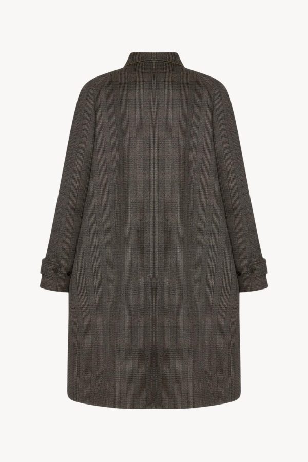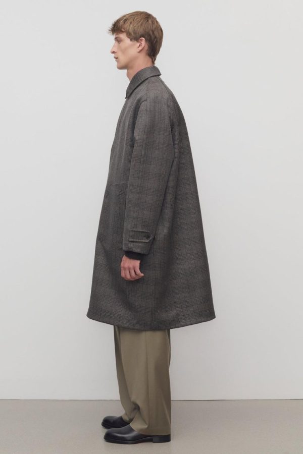 Reversible single-breasted car coat in glen check virgin wool and silk with raglan construction, patch and welt pockets, and concealed front placket with button closure.