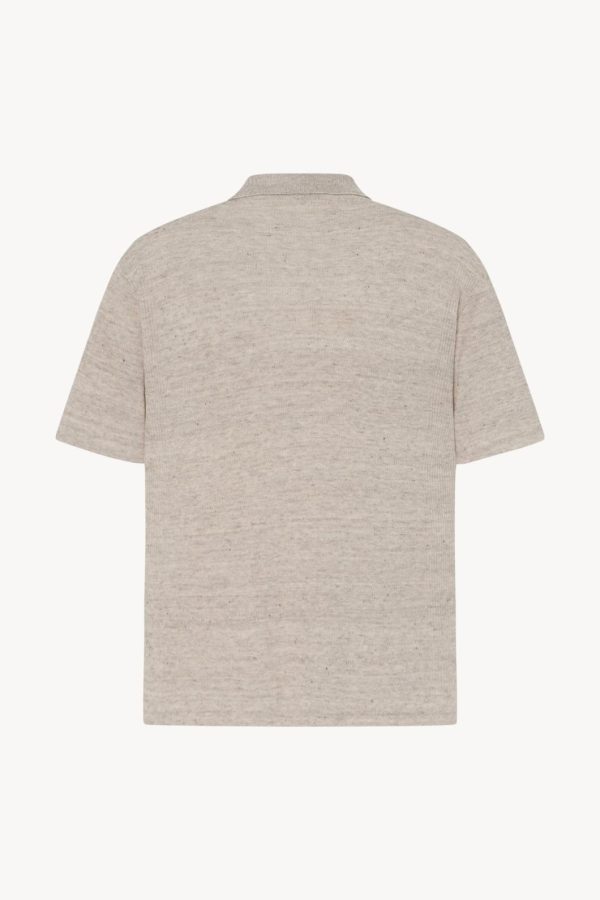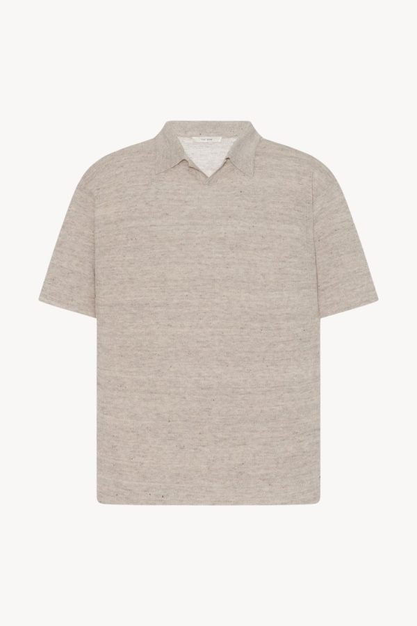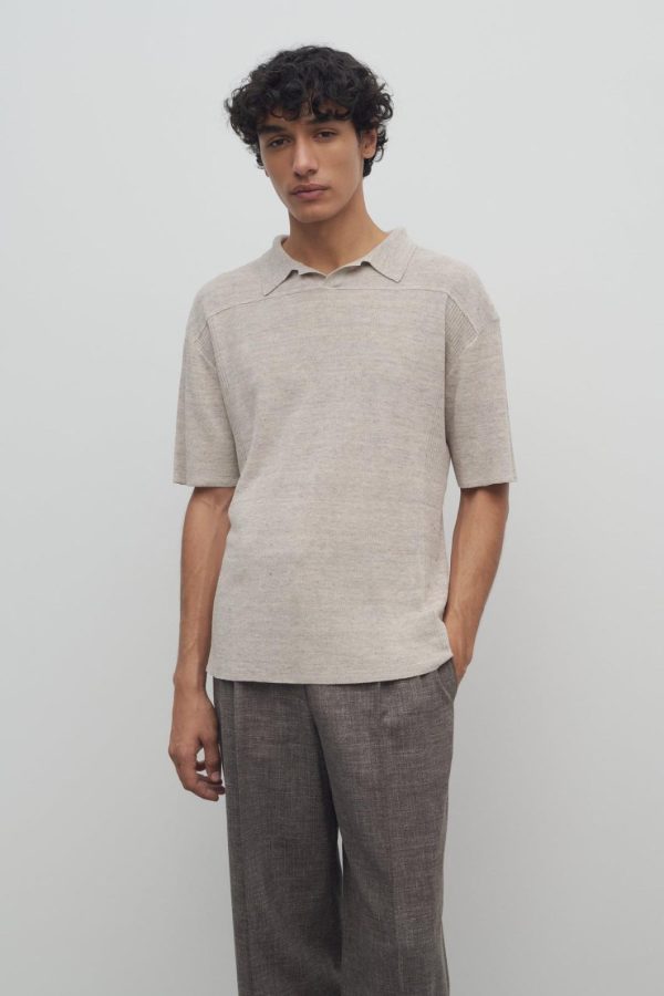 Short-sleeved polo top in textured linen and cotton knit with slim fit, buttonless front tab, and intarsia rib-knit at sides.