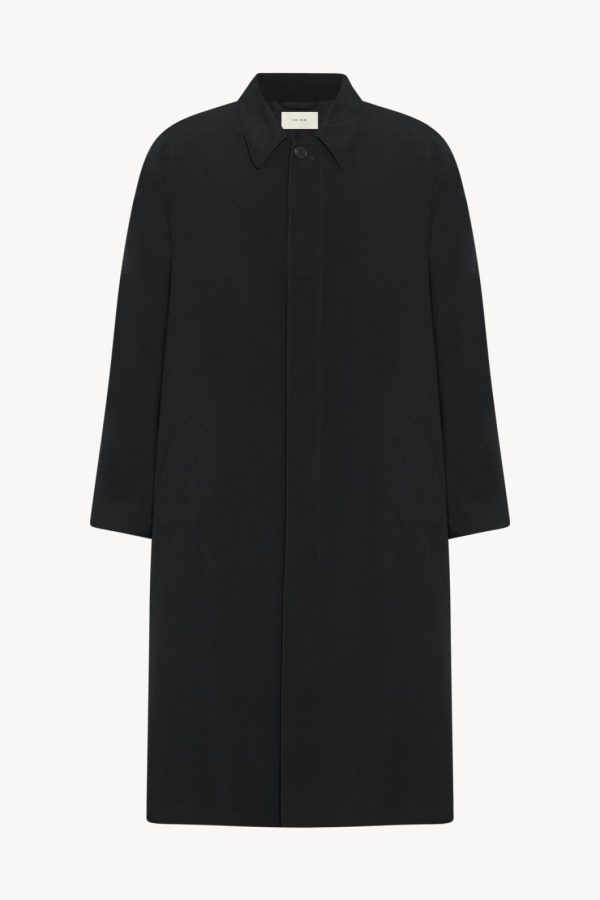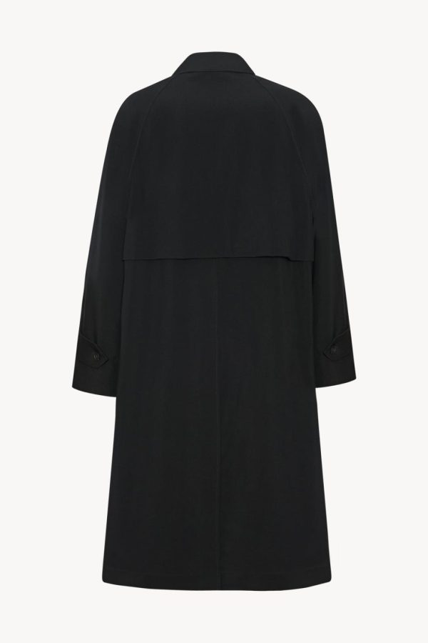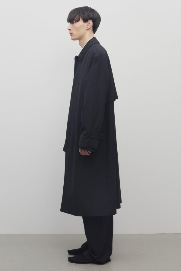 Single-breasted trench coat in crisp tropical wool with back storm flap, front welt pockets, and concealed front placket with horn button closure.