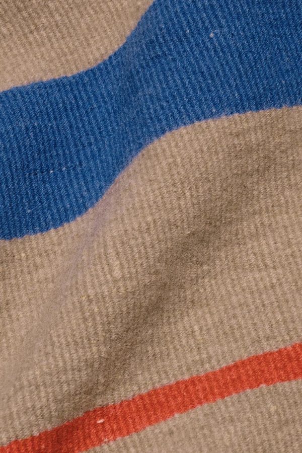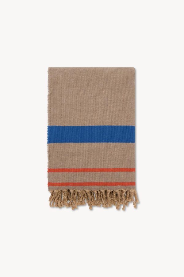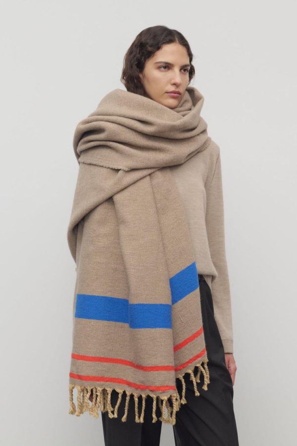 Wide woven scarf in textured silk and cashmere with contrast stripe motif and fringed finish.