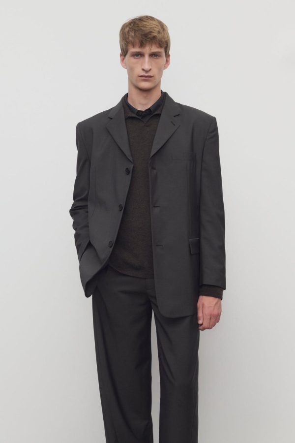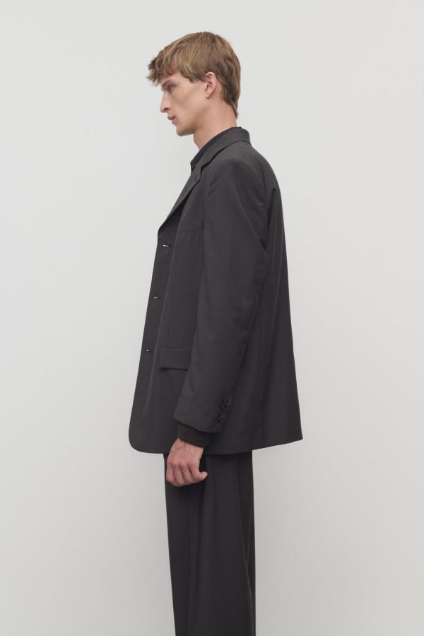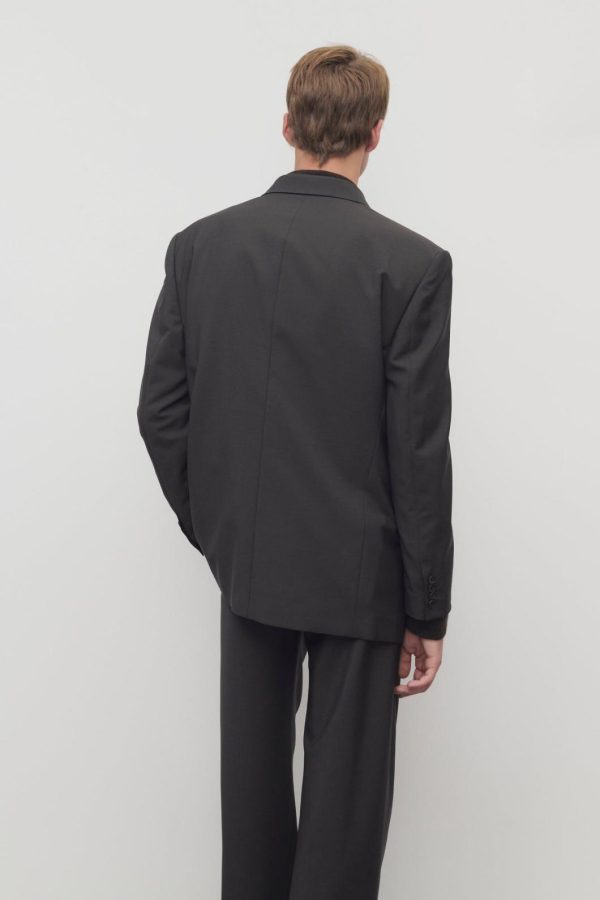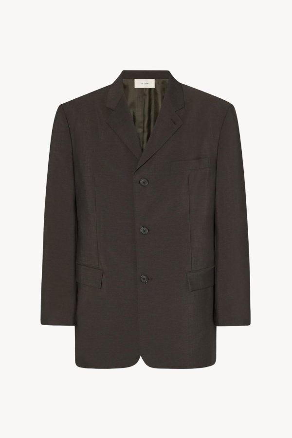Single-breasted tailored jacket in lightweight virgin wool and mohair with notch lapel, front flap pockets, and front button closure.