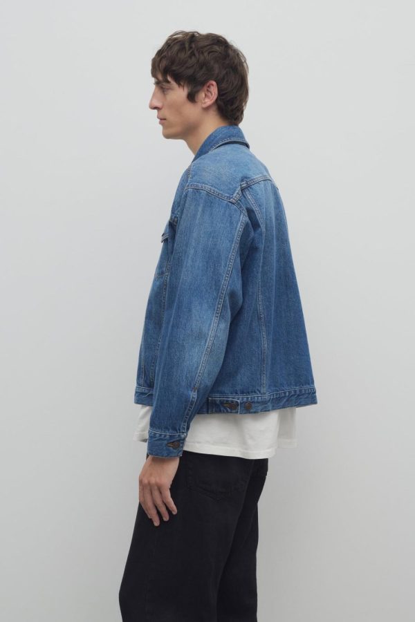 Classic denim jacket in garment treated denim with two front patch pockets, angled front seams, and front button placket.