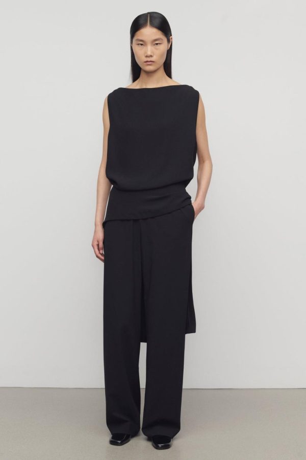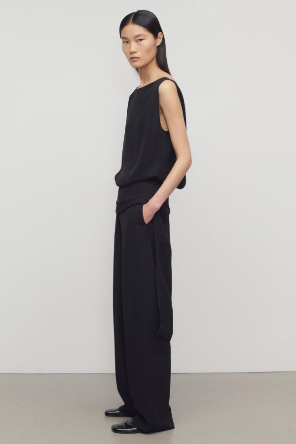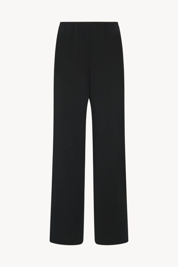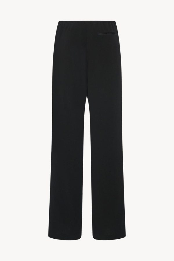 High-rise pull-on pant in stretch wool with straight leg, slanted side pockets, and slim gathered elastic waistband.