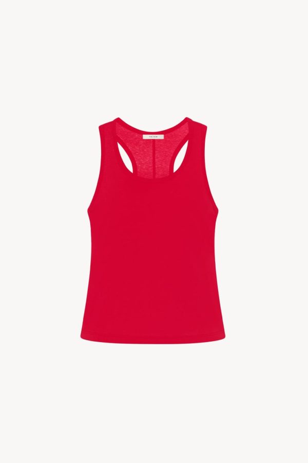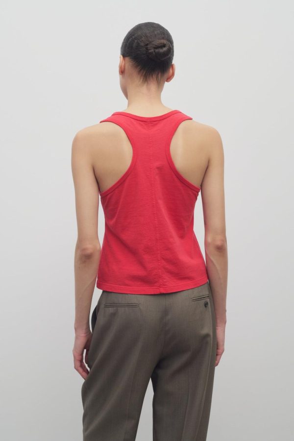 Light tank top in organic cotton jersey with slim fit, ribbed neckline, and signature center back detail.