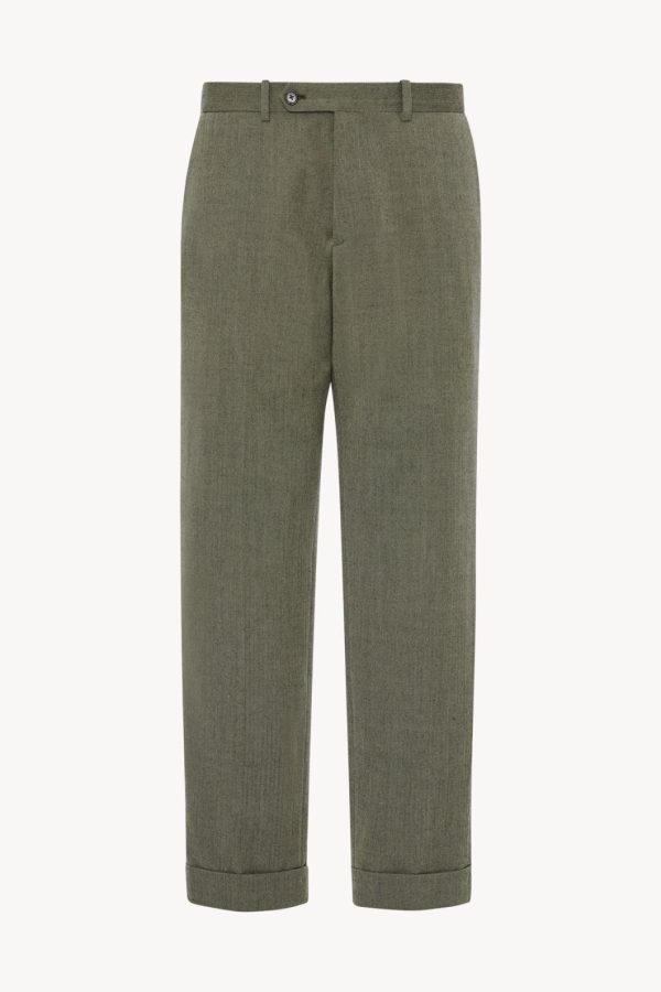 High-rise tailored trouser in herringbone wool with front and back creases, slanted side and back welt pockets, and cuffed hem.