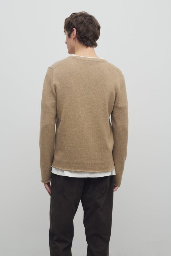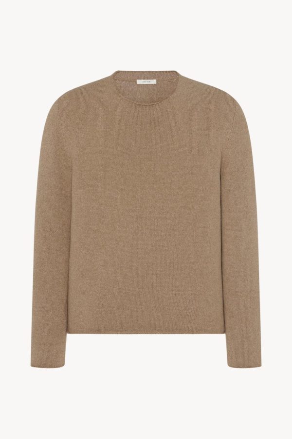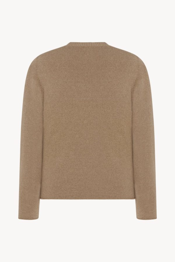 Long-sleeved crewneck sweater in finely knit wool and cotton with relaxed, boxy fit and ribbed back neckline.